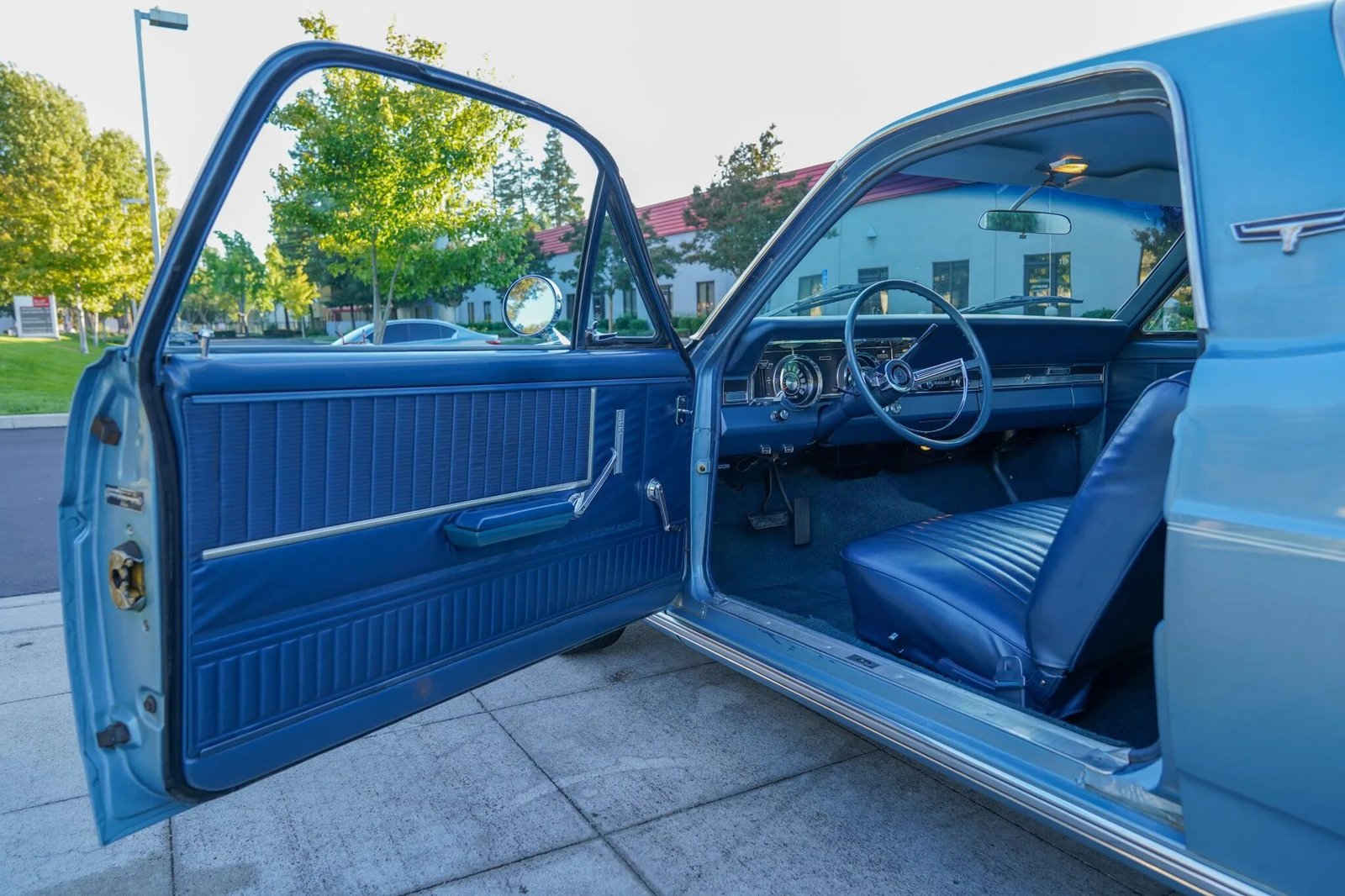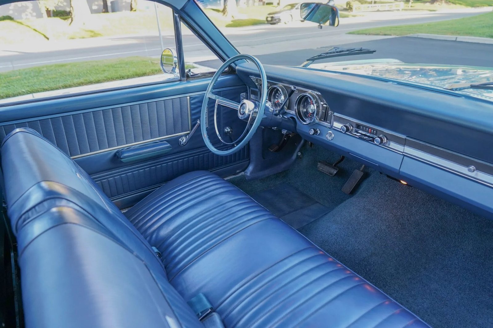 The cabin features a split-back bench seat trimmed in blue vinyl along with matching door panels.