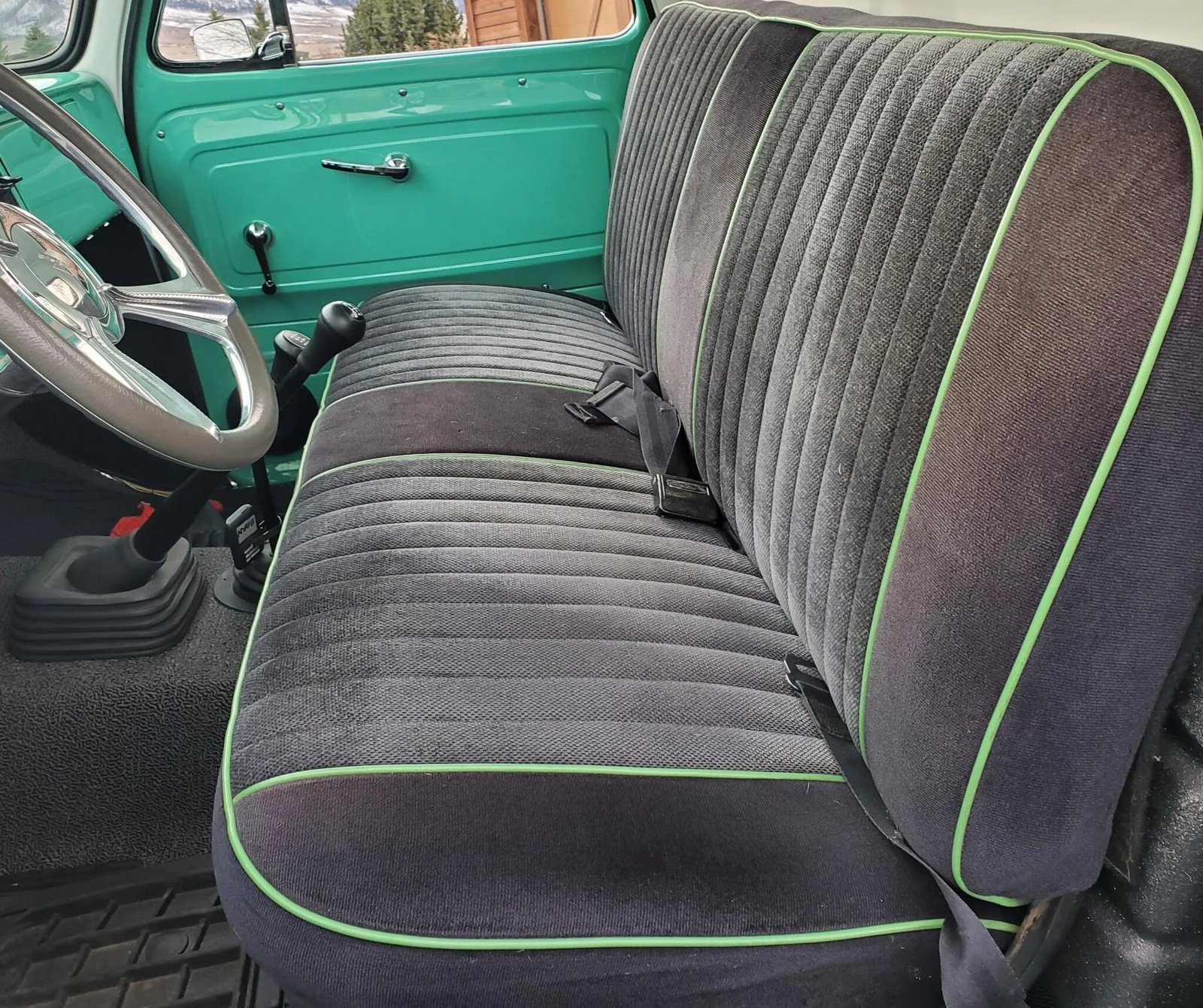 The cabin features a bench seat upholstered in black cloth with green piping joined by matching carpets.