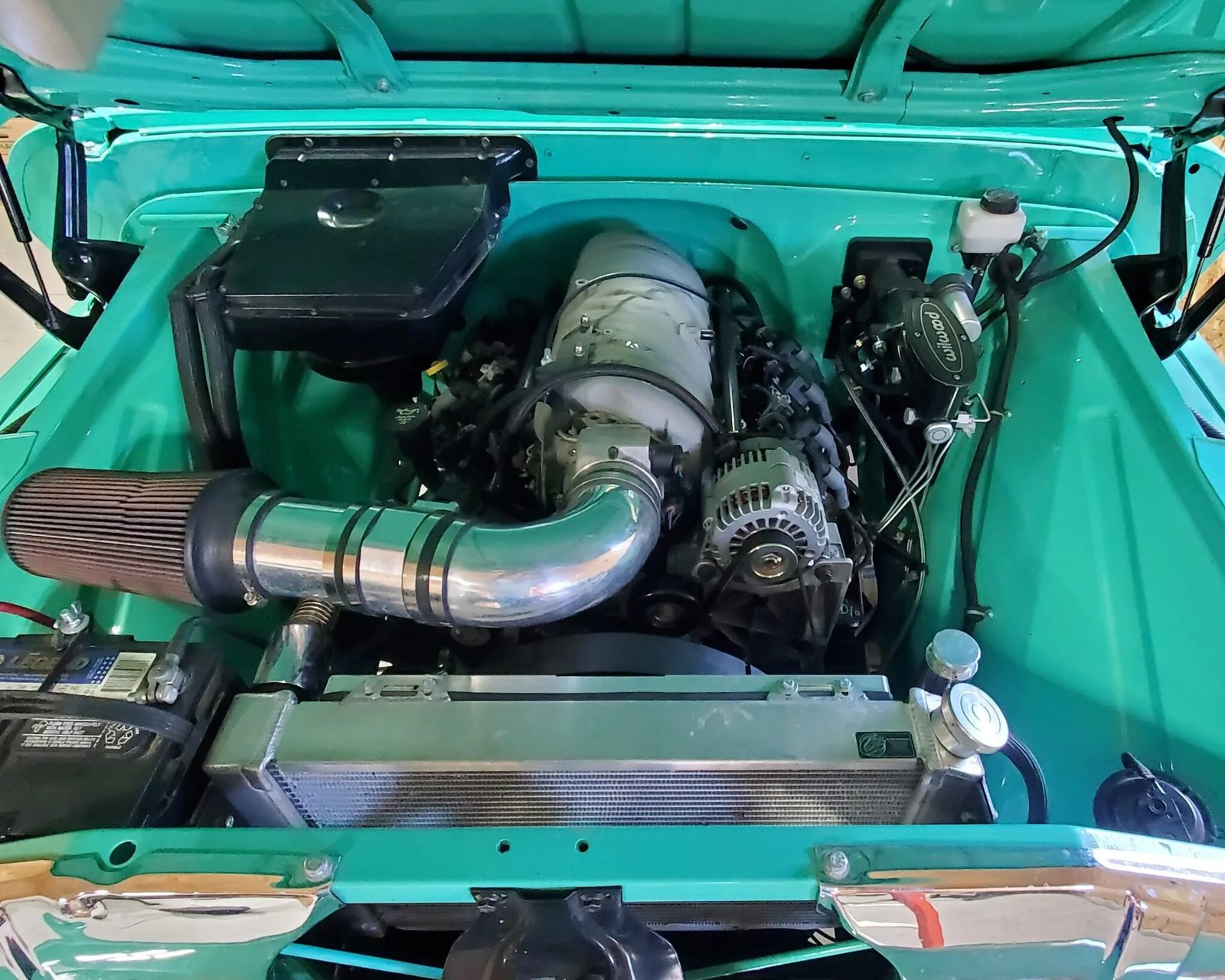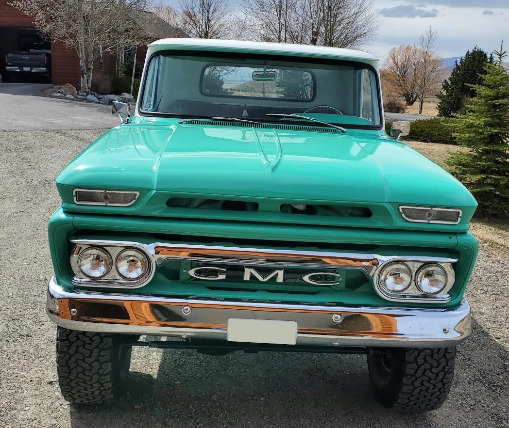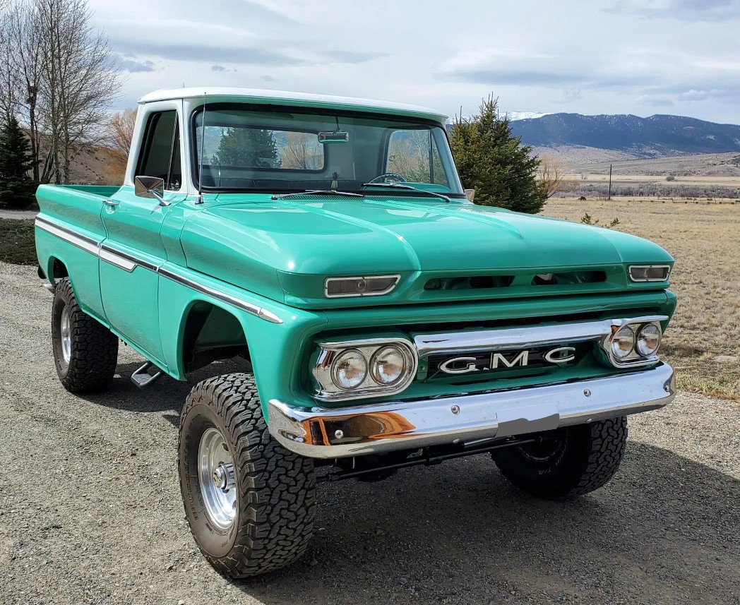 This 1966 GMC K10 is a short-box fleetside pickup finished in Atlas Green and white over black and powered by a 6.0-liter V8 paired with a five-speed manual transmission and a dual-range transfer case.