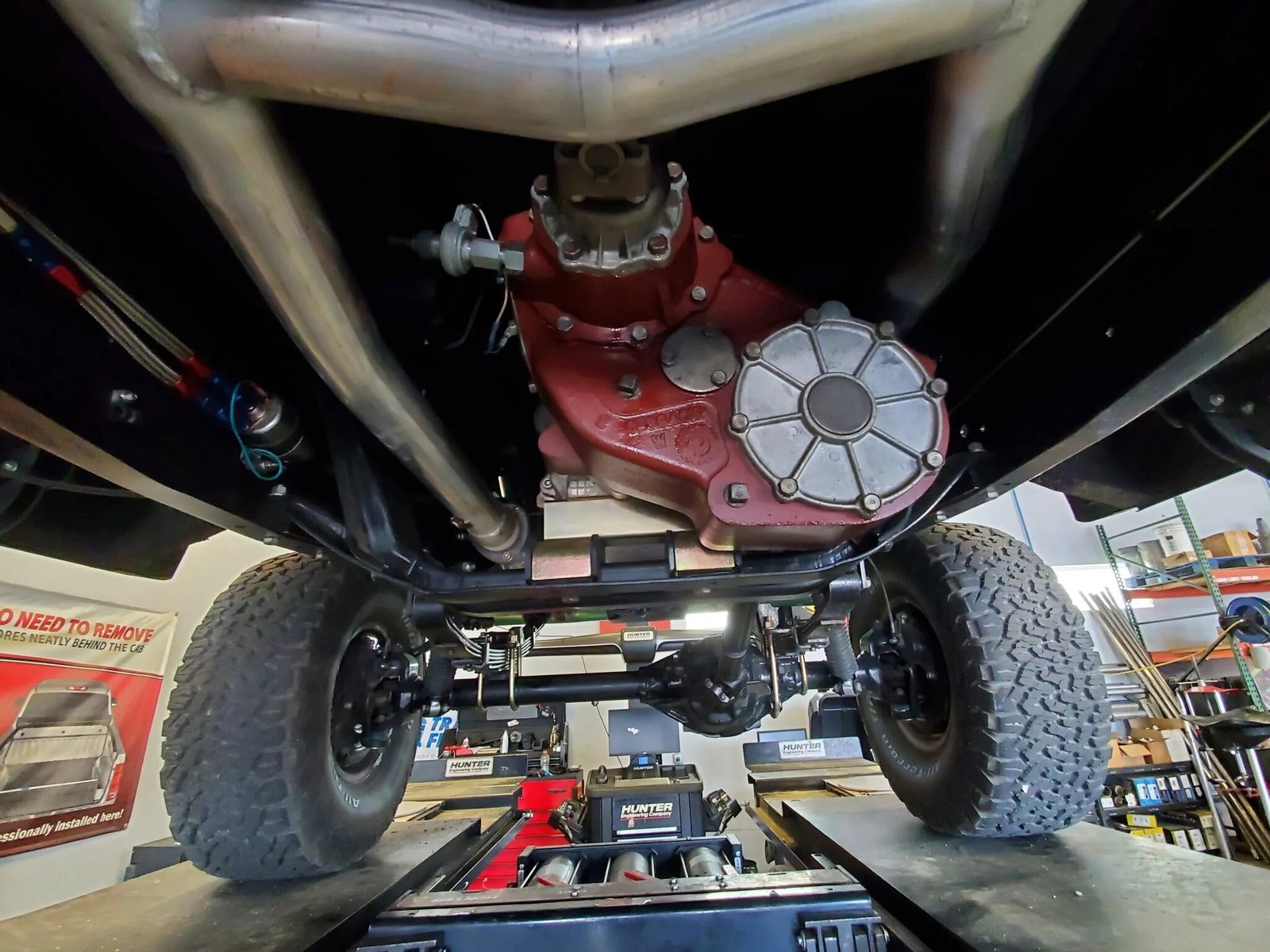 The truck is equipped with power steering, a hydroboost assisted braking system, manually-locking front hubs, a lift kit, and Bilstein shock absorbers.