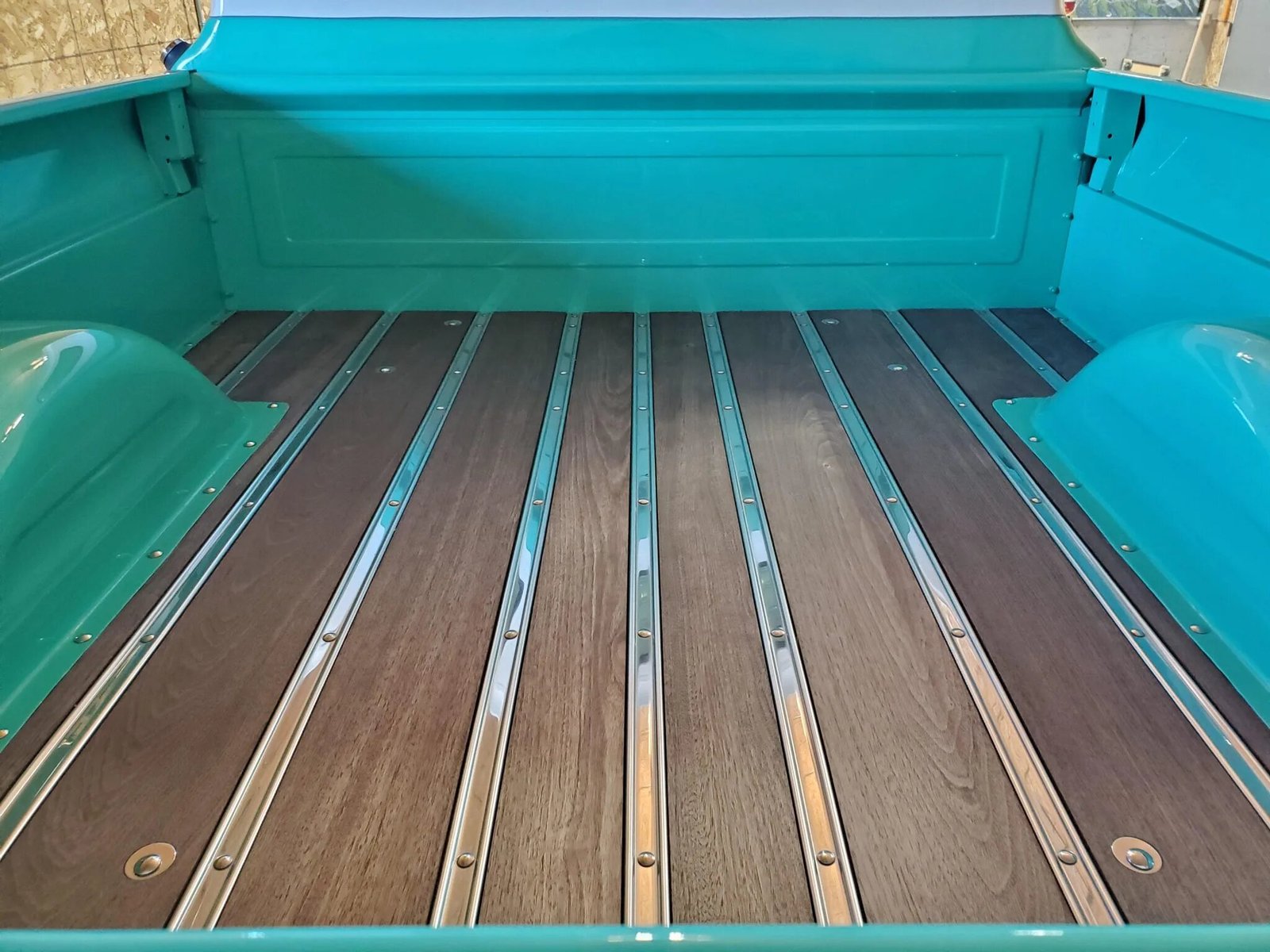 Features include a bright metal grille and body side trim, small rear window, wood-lined bed, dual mirrors, chrome bumpers, quad headlamps, side steps, and a dual-outlet exhaust that exits below the rear bumper.