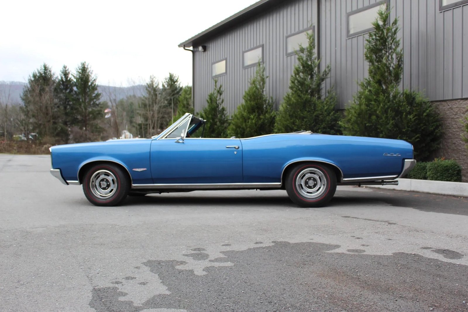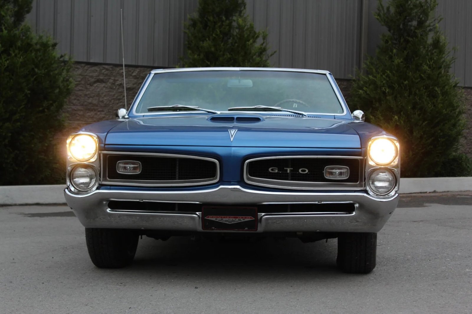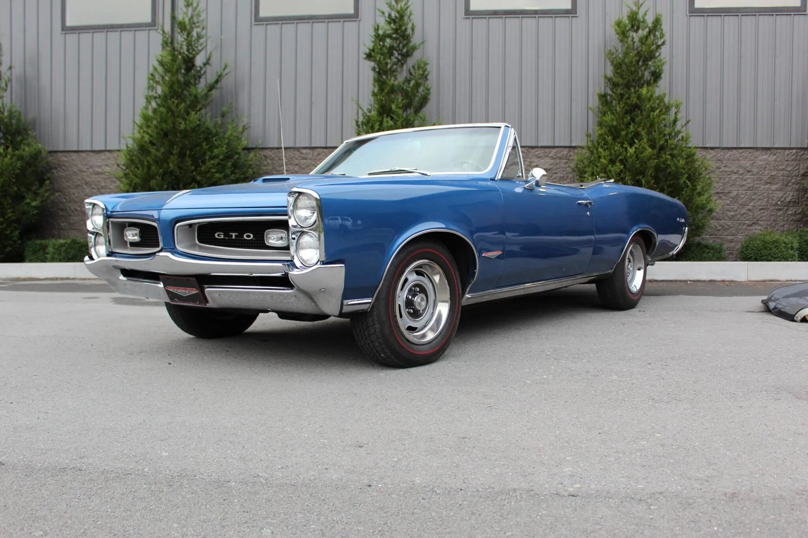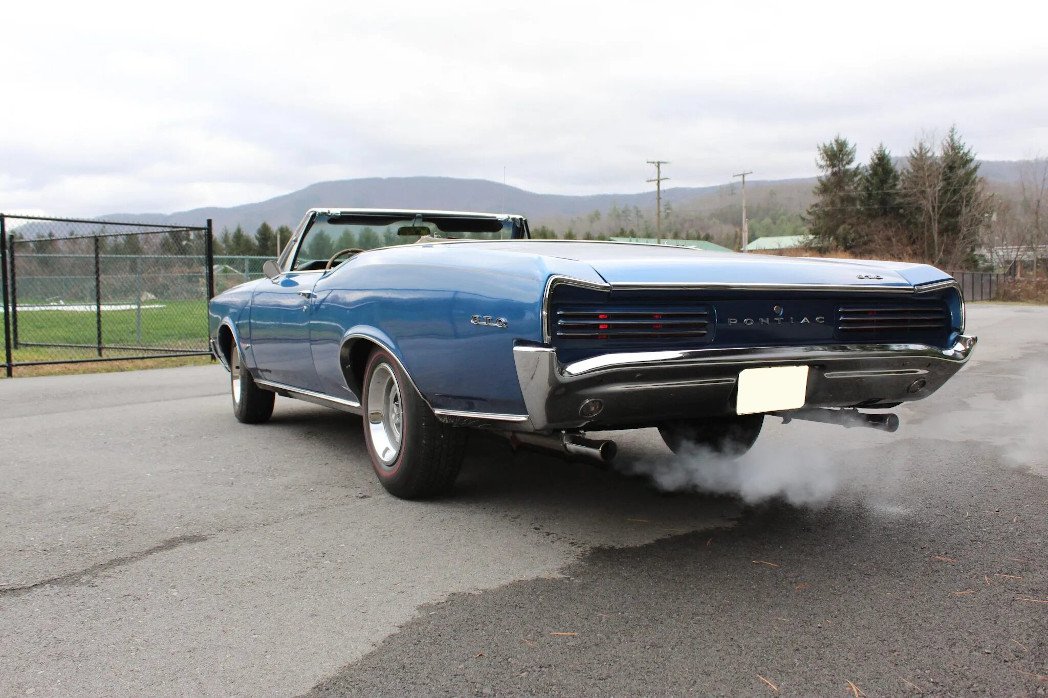 The body is finished in blue and have been repainted. Features include a power-operated convertible top, GTO badging, a hood scoop, stacked vertical headlamps, reverse lamps, chrome bumpers, bright finished rocker and wheel opening trim, and a dual-outlet exhaust that exits below the rear bumper. The convertible top mechanism was repaired in 2022.