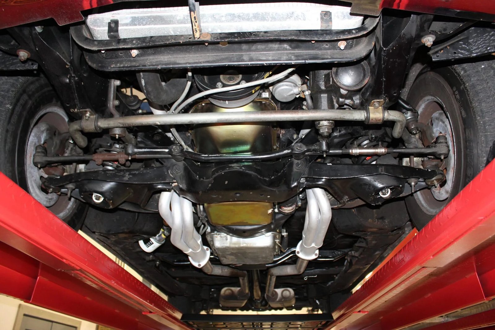 Power is sent to the rear wheels through a four-speed automatic transmission. The rear pinion seal and flexplate were replaced in 2019, the rear axle tubes were repaired to address leaks, and a custom transmission cross member mount was installed. A custom dual exhaust system with Flowmaster mufflers has been fitted.