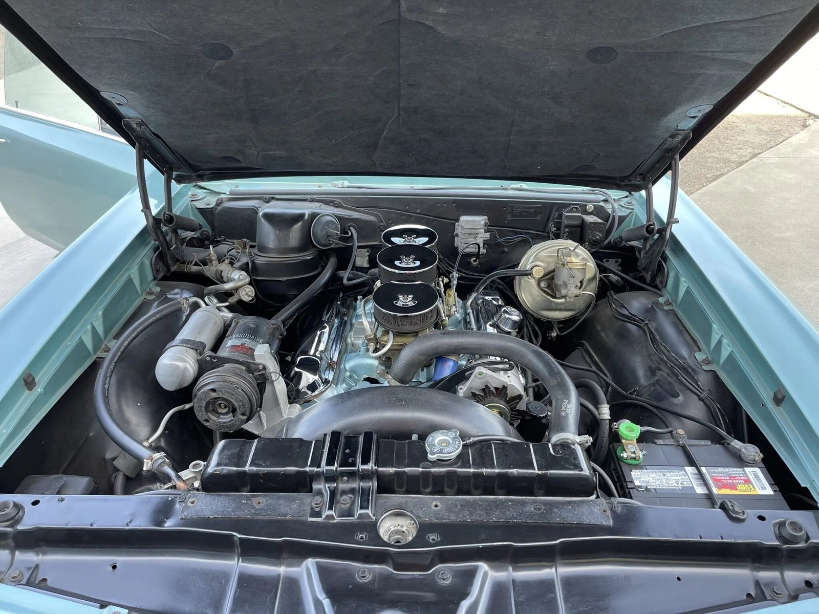 The 389ci V8 is equipped with Tri-Power induction consisting of three two-barrel Rochester carburetors under individual chrome air cleaners.