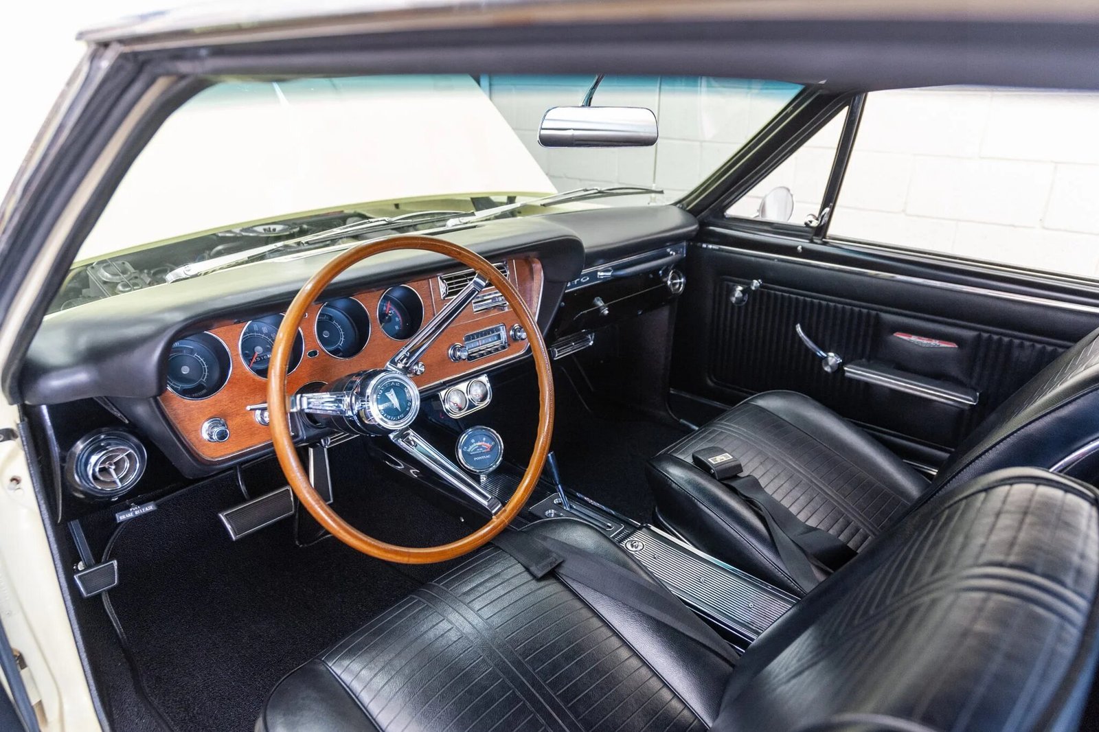 The black interior was factory fitted with air conditioning and features front bucket seats, a rear bench, a center console, a padded dash, and a Pontiac-branded AM radio.