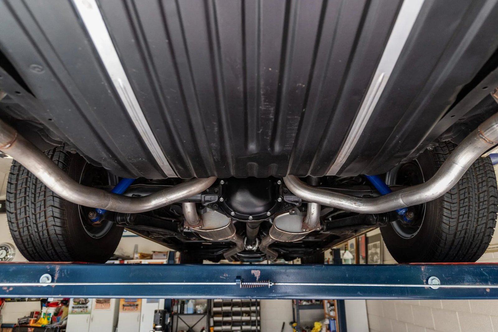 The dual exhaust features chrome finishers that terminate below the rear bumper, and other features include a hood scoop, bright lower-body trim, and GTO badging.