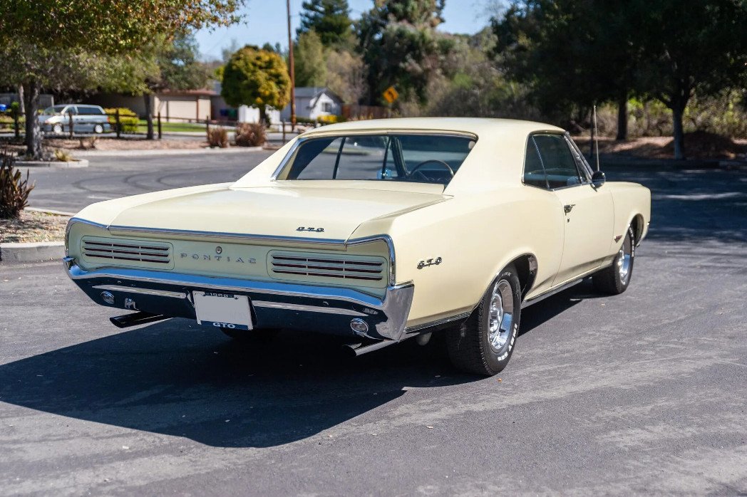 This 1966 Pontiac GTO hardtop is powered by a 389ci V8 fitted with triple two-barrel carburetors and paired with a two-speed automatic transmission.
