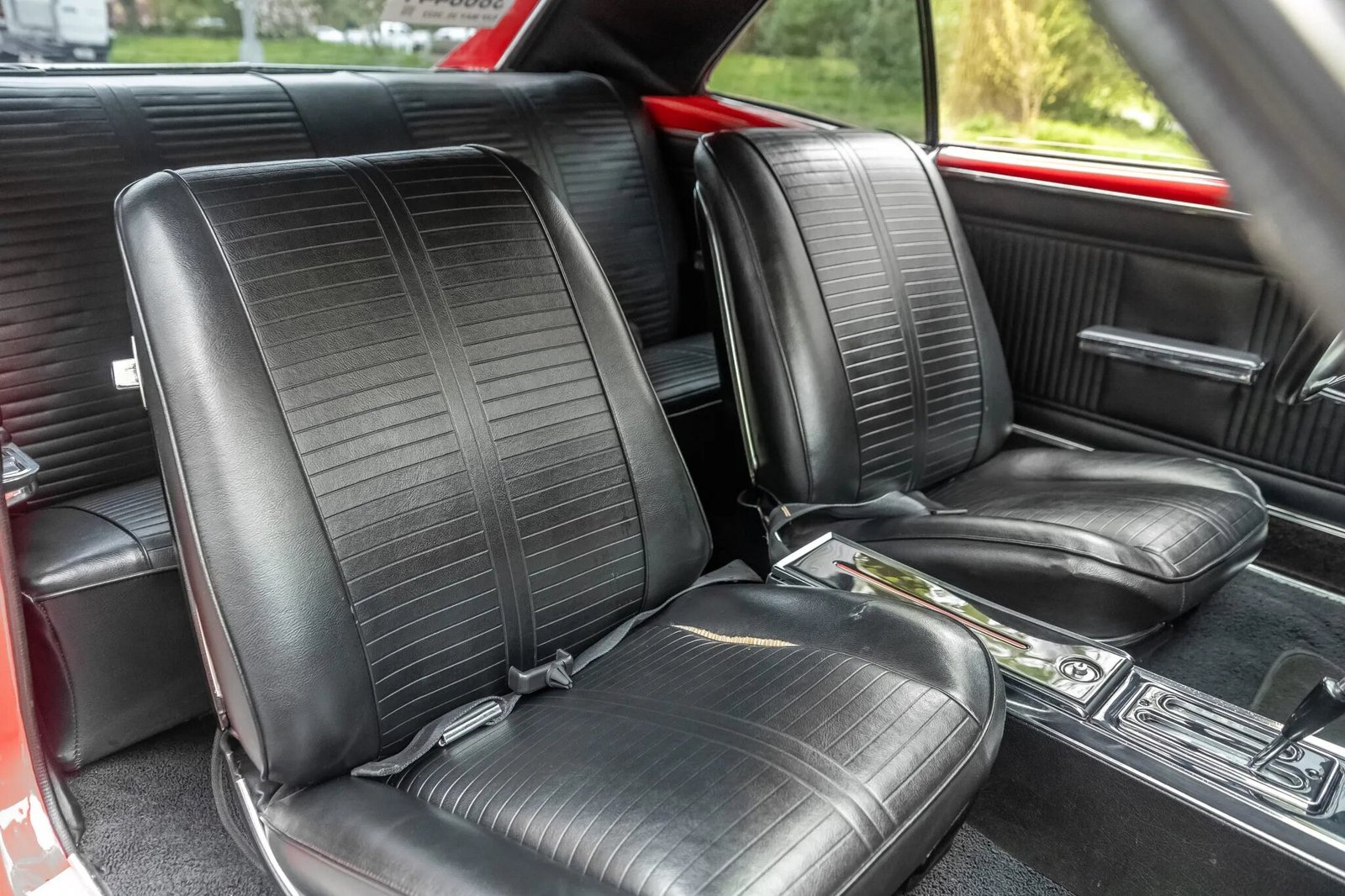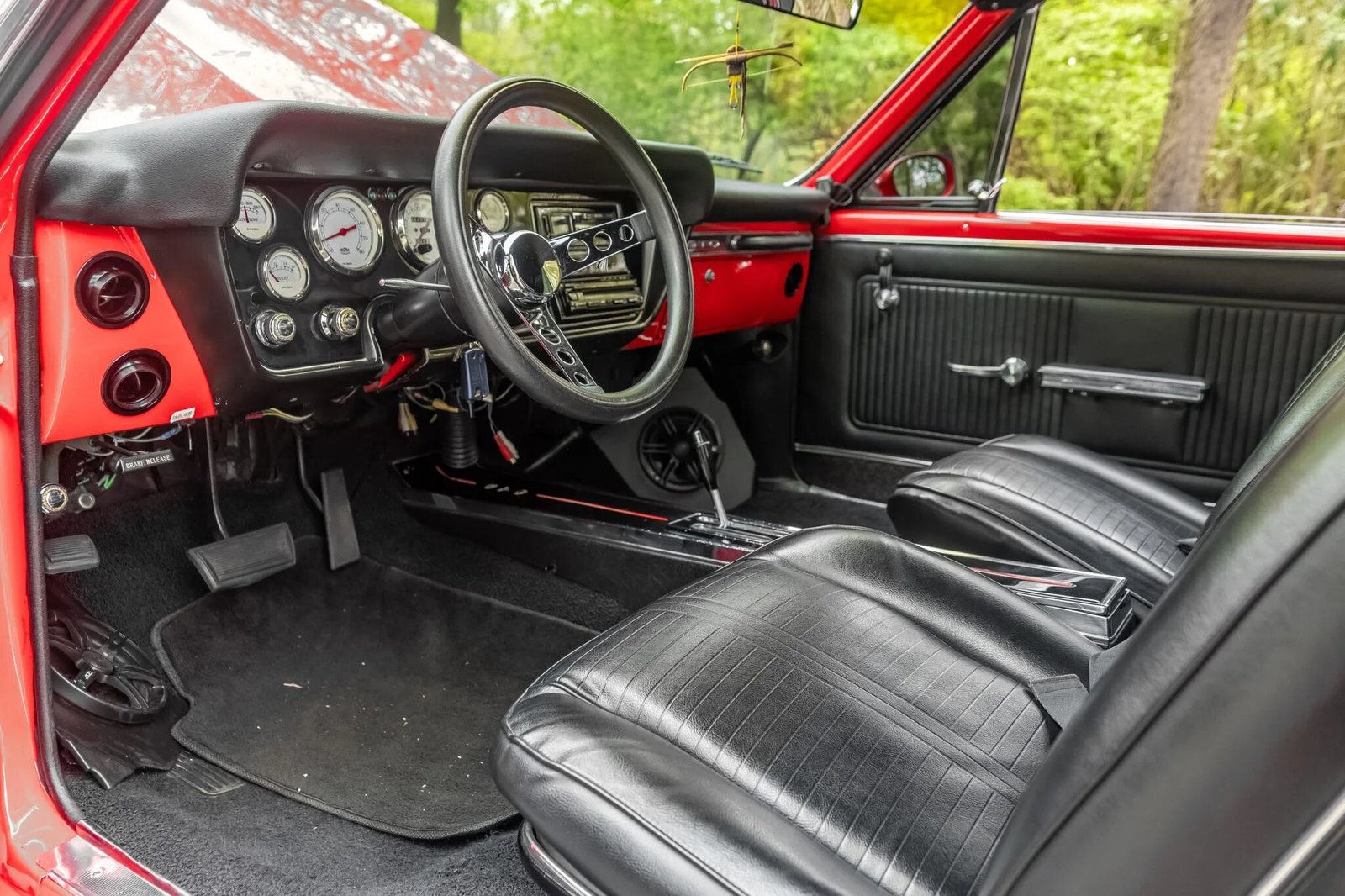Black vinyl upholstery is fitted in place of the factory Turquoise trim (214) and is accompanied by body-color trim on the dashboard and door panel caps.