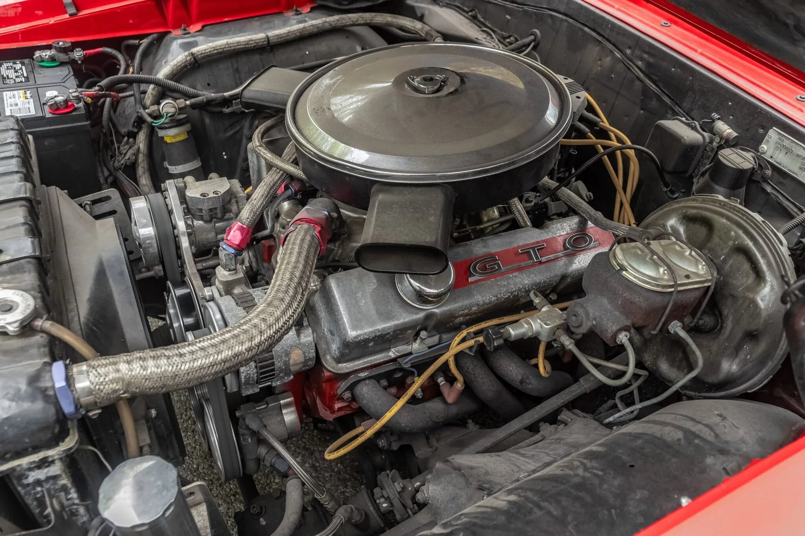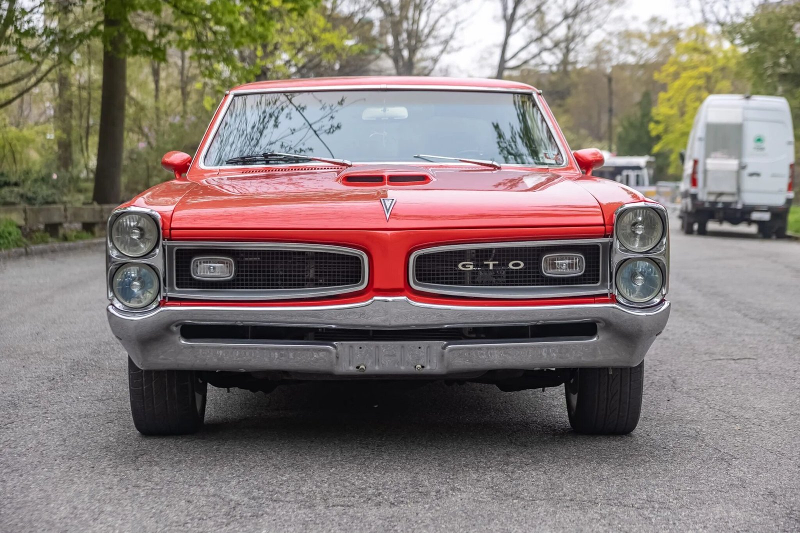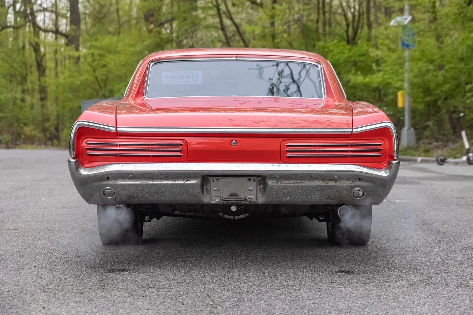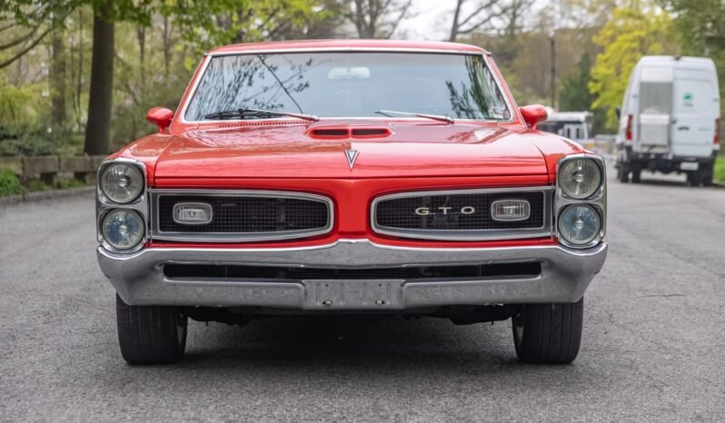 The car wears an orange refinish with chrome trim, body-color mirror caps, GTO badges, and aftermarket window tint on the quarter windows and rear window.