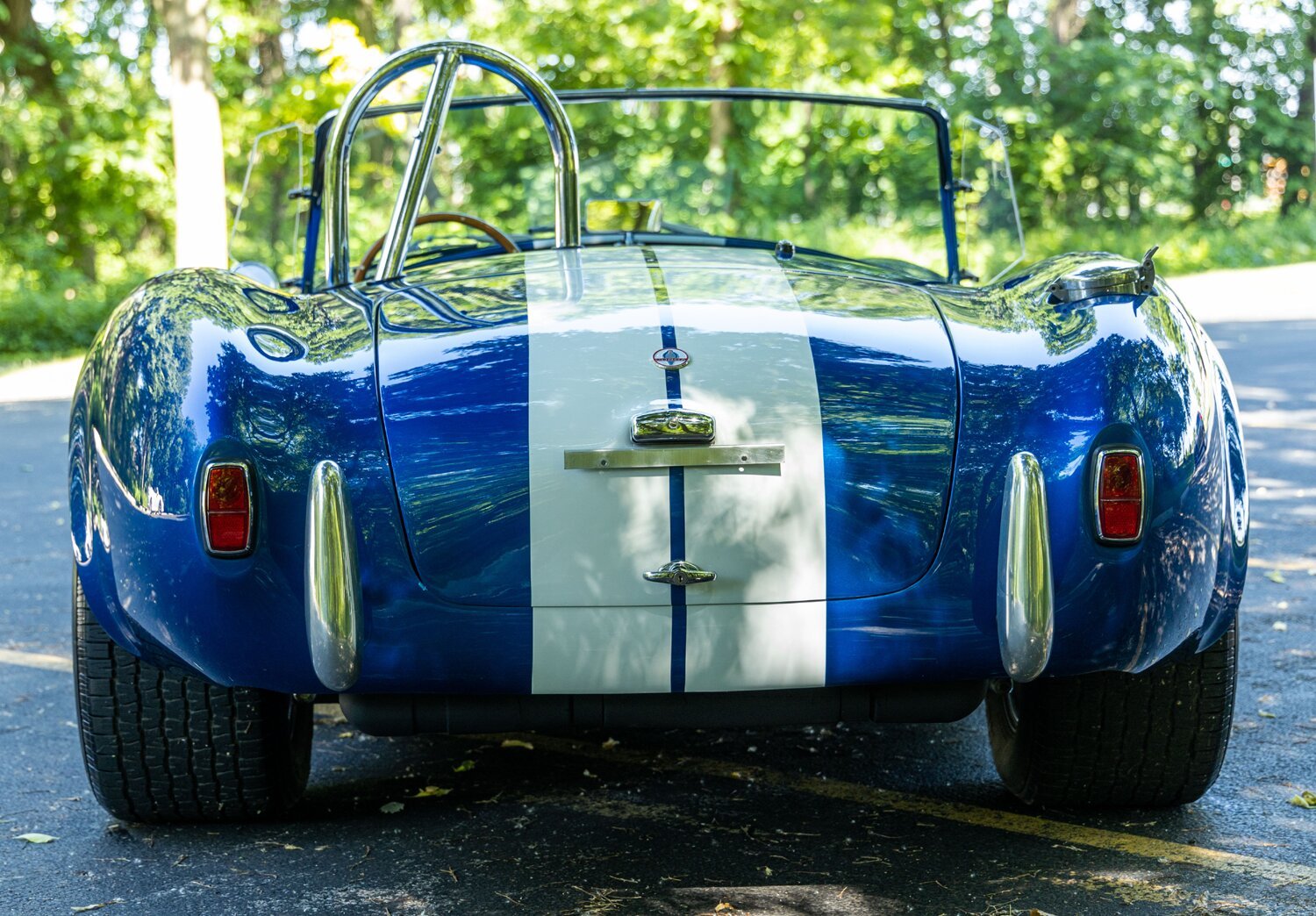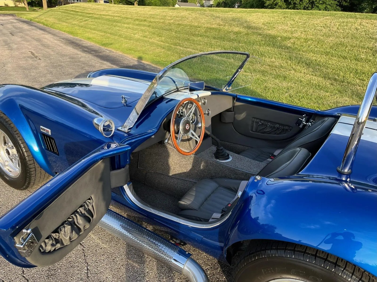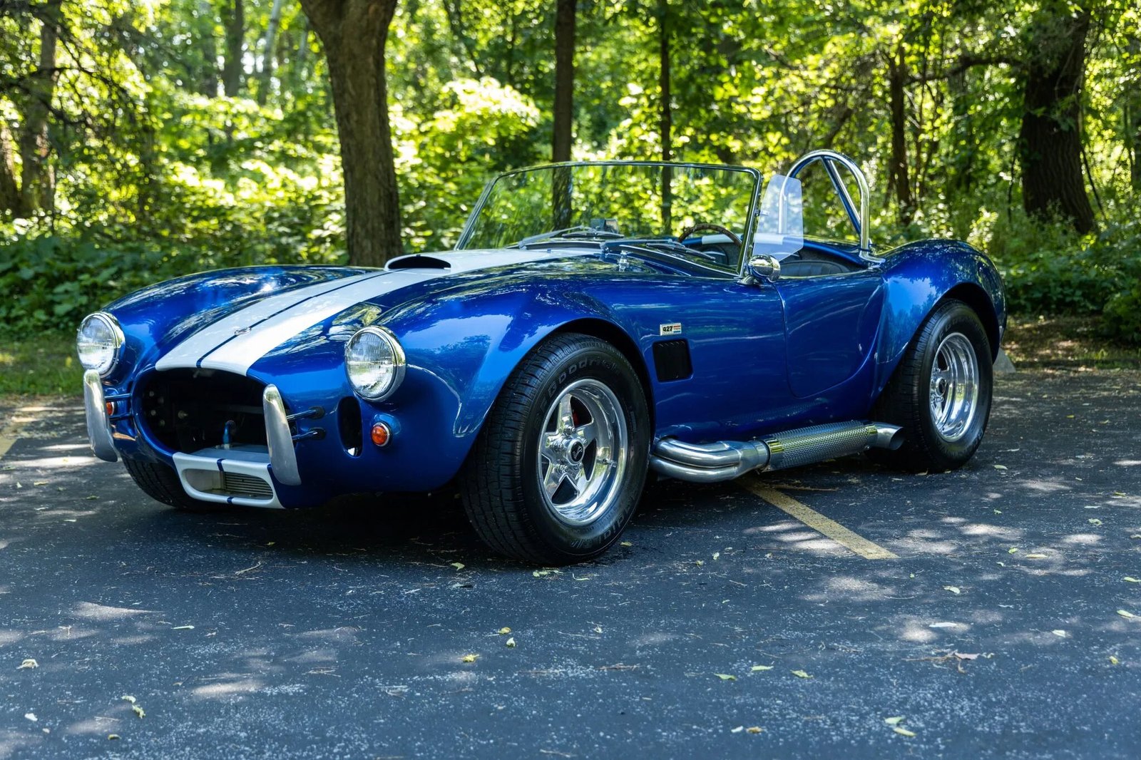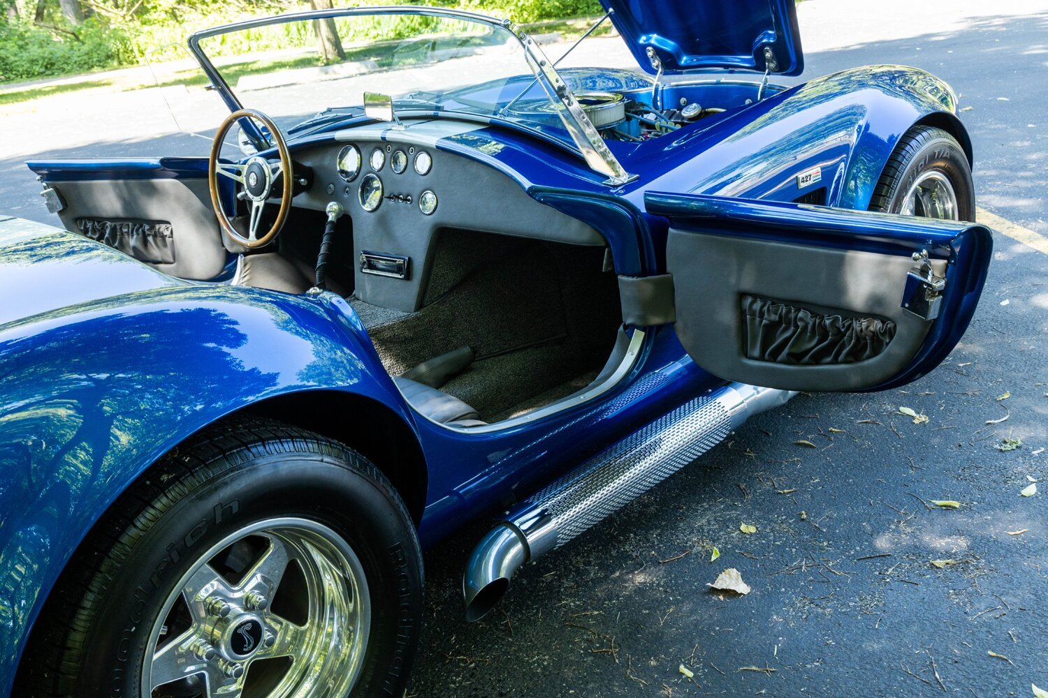 Exterior features include a driver-side roll hoop, a hood scoop, a Le Mans-style fuel filler, wing windows, side-exit exhaust pipes, Cobra and 427 badging, and front and rear bumperettes.