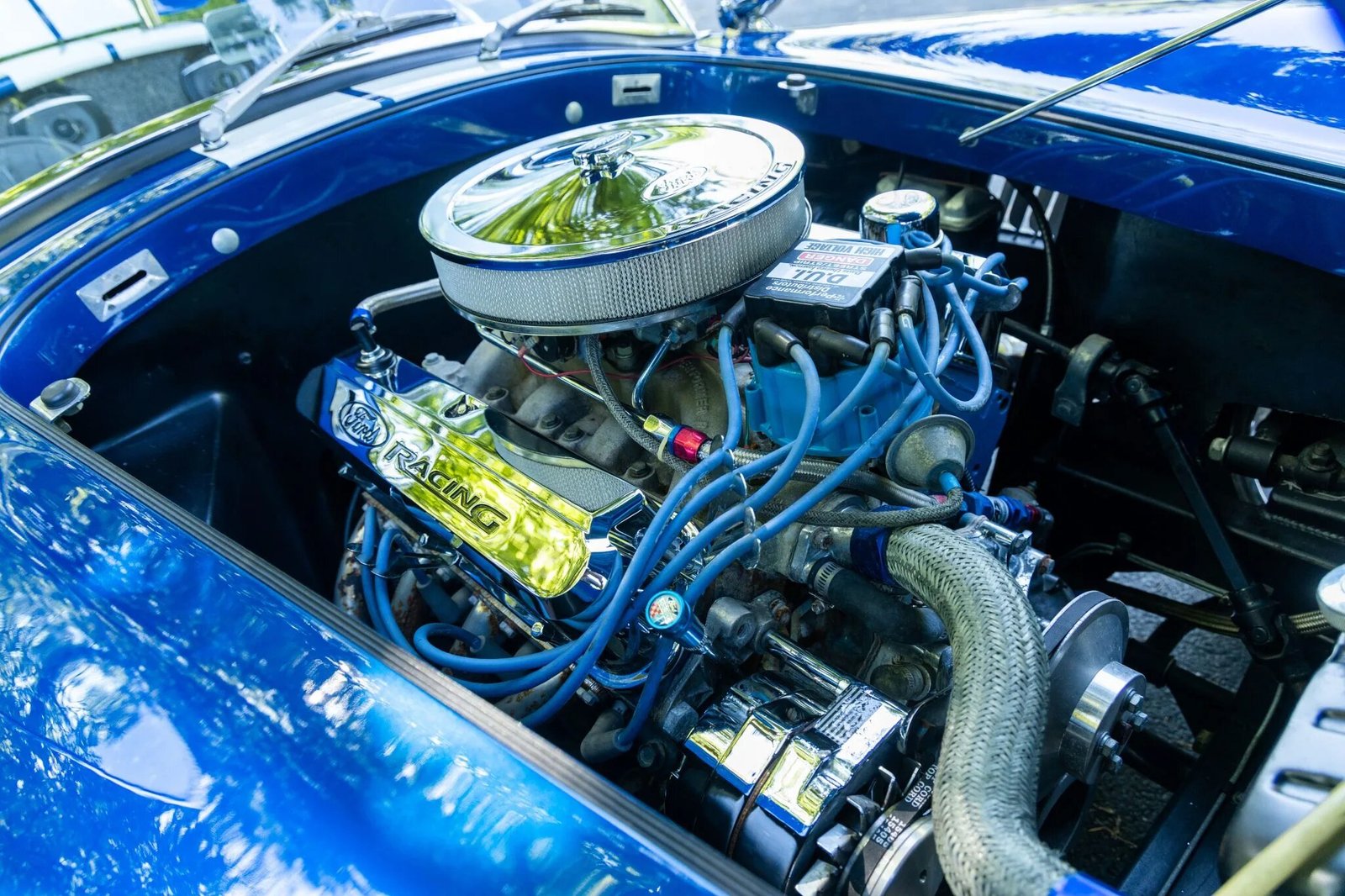 The Ford 357ci V8 wears is feature Roush 200 cylinder heads and T&H rocker arms, and it is equipped with a Davis Unified Ignition distributor, an Edelbrock intake manifold, a chrome air cleaner cover, and valve covers.
