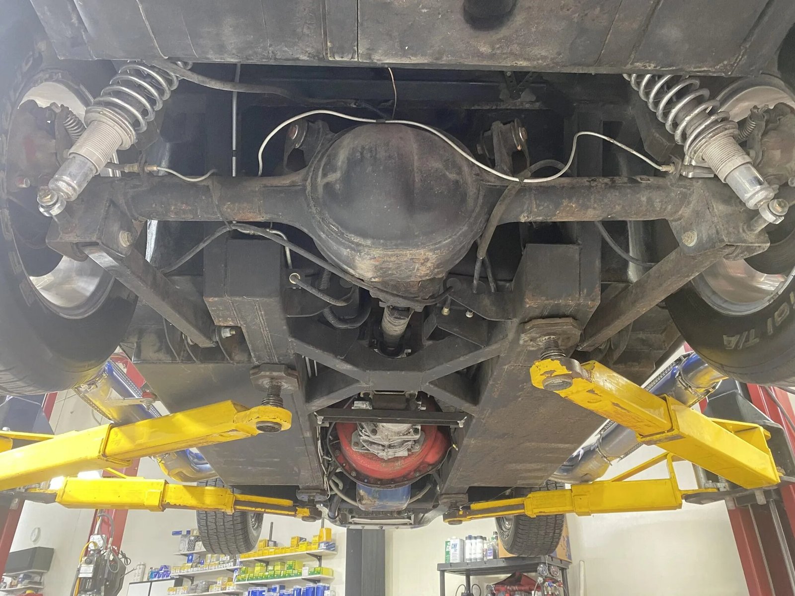 The car is equipped with rack and pinion steering and rides on height-adjustable coilover shocks and a four-link rear axle.