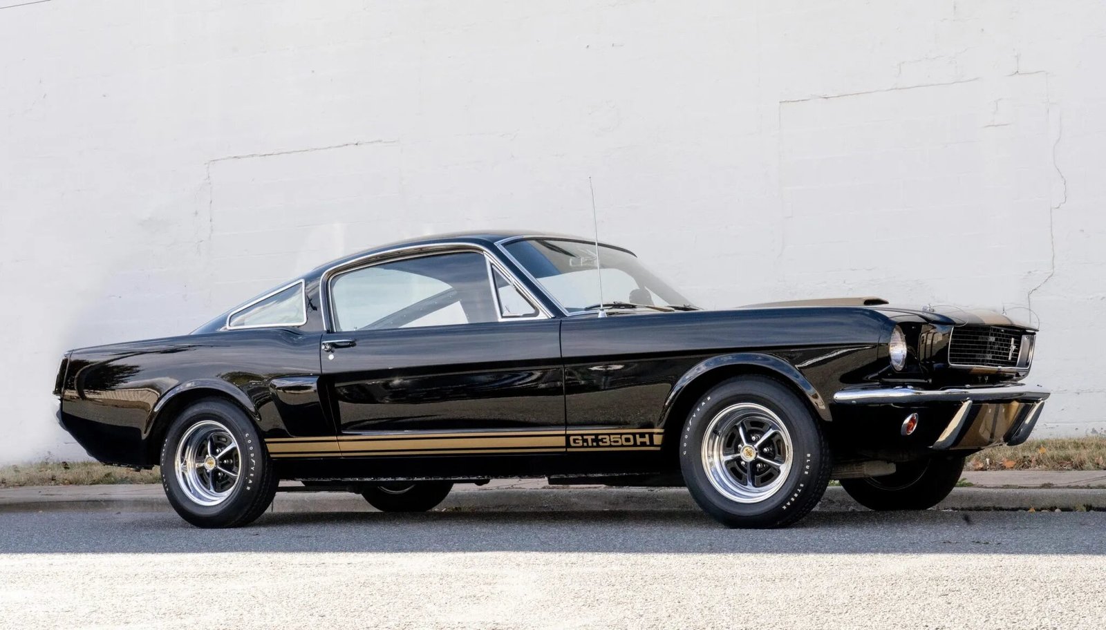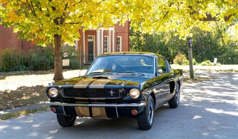 Approximately 1,000 GT350H examples were produced as part of a partnership between Ford and the Hertz car rental company. This car was refinished by the owner in black with gold stripes, and replacement seals and weatherstripping were sourced at that time. Features include a hood scoop, quarter windows, and side scoops along with a bullet-style side mirror and a Shelby front valance.