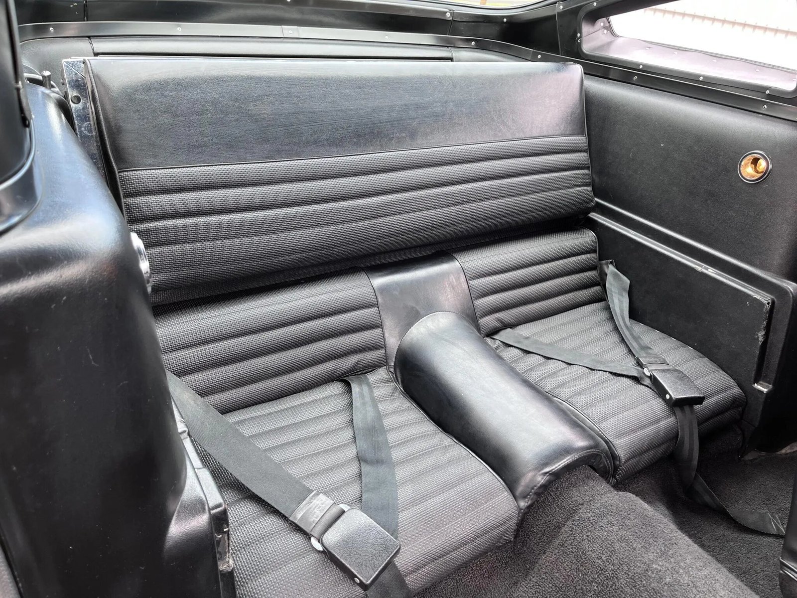 The cabin features front bucket seats that were recently retrimmed in black vinyl over replacement foam, and are accompanied by a folding rear bench. A Ford-branded AM radio is mounted in the center of the dashboard along with a competition brake warning sticker, and additional equipment includes a dash-mounted tachometer and latch-and-link harnesses for both occupants.