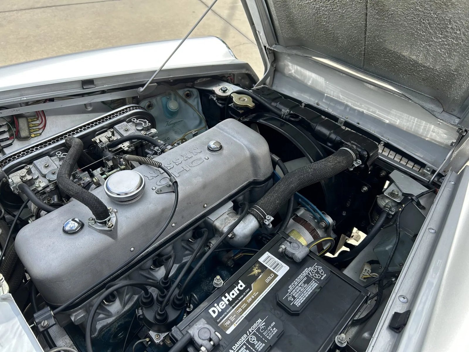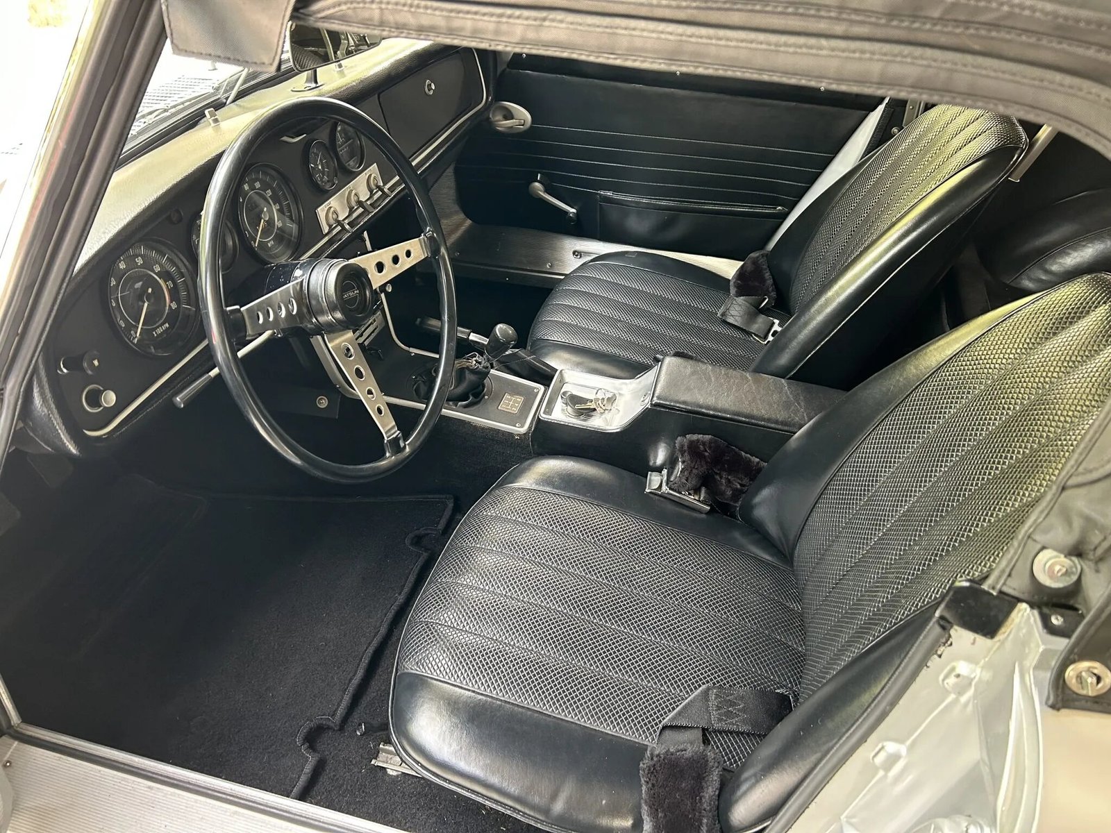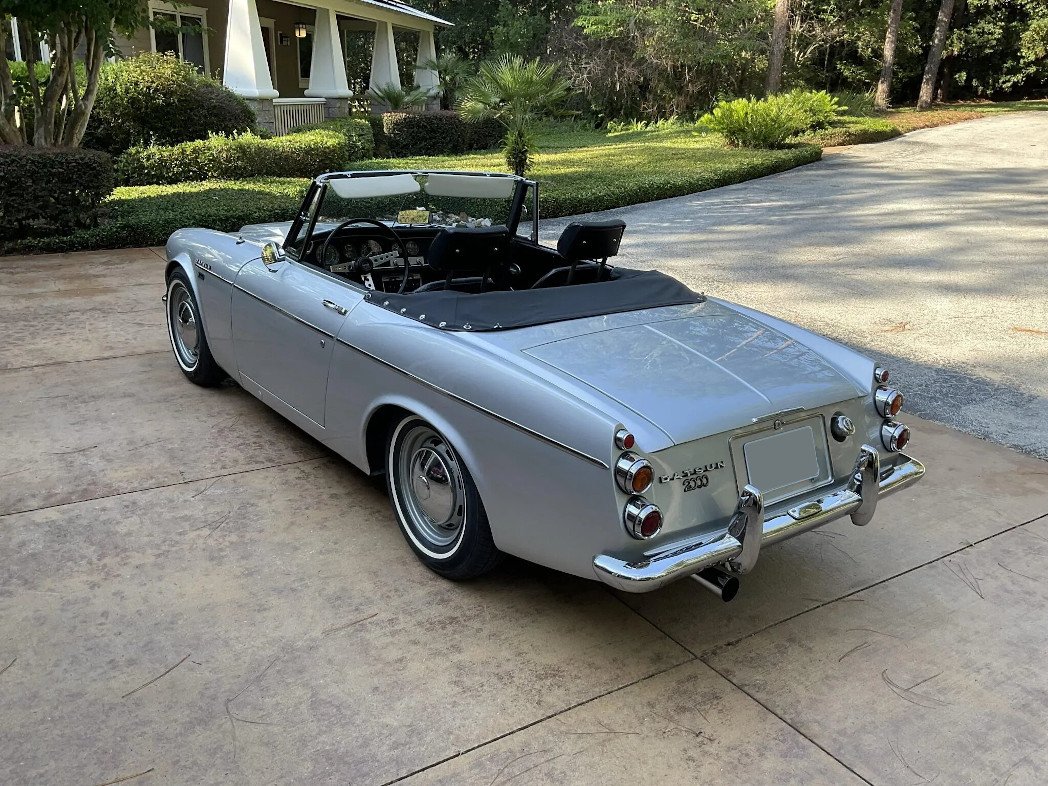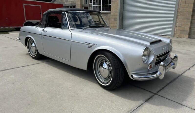 This 1967.5 Datsun 2000 Roadster was refurbished by Mike Young at Datsun Sports, and is powered by a 2.0-liter inline-four mated to a five-speed manual gearbox. The car was refinished in silver over black vinyl upholstery and is equipped with a black soft top, 14″ steel wheels with chrome hubcaps, KYB Gas-A-Just shocks, front disc brakes, dual Solex carburetors, an aluminum oil pan, chrome bumpers and trim, a driver-side door mirror, and an AM radio.