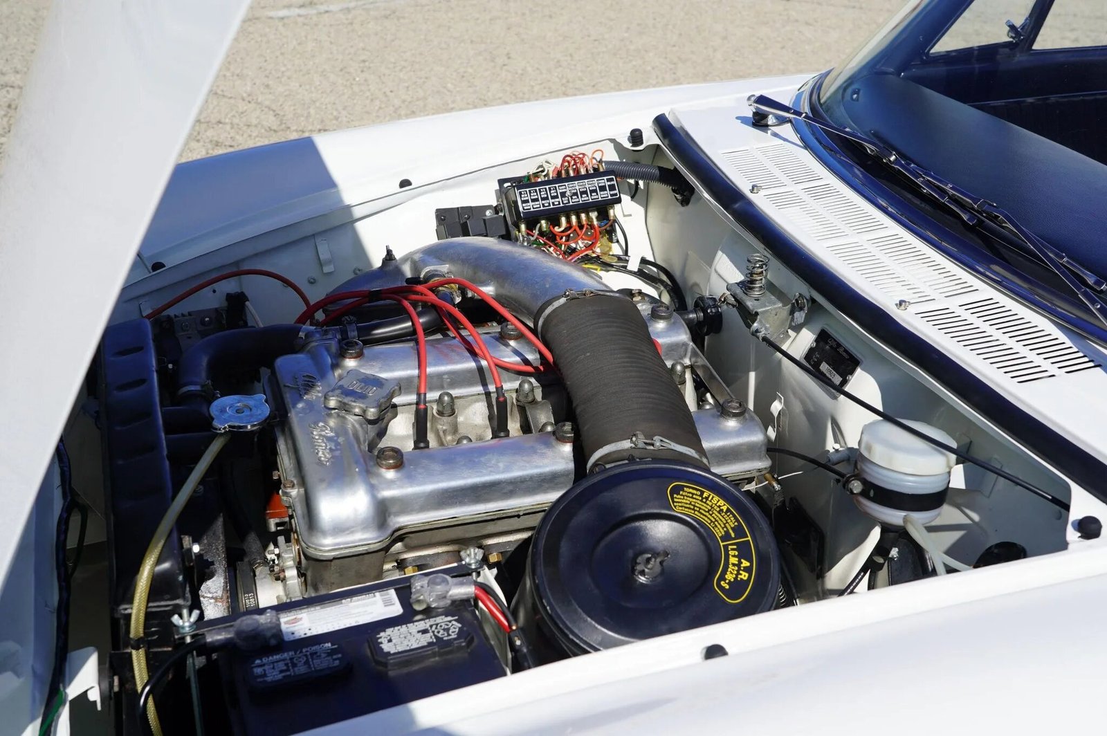 The car was stripped, placed on a chassis dolly, and repainted its factory shade of white, and additional work included rebuilding the 1.6-liter inline-four and front brake calipers, resealing the front of the five-speed manual transmission, reupholstering the interior in black vinyl, and replacing the black soft top, dashboard pad, wiring harness, and suspension bushings.