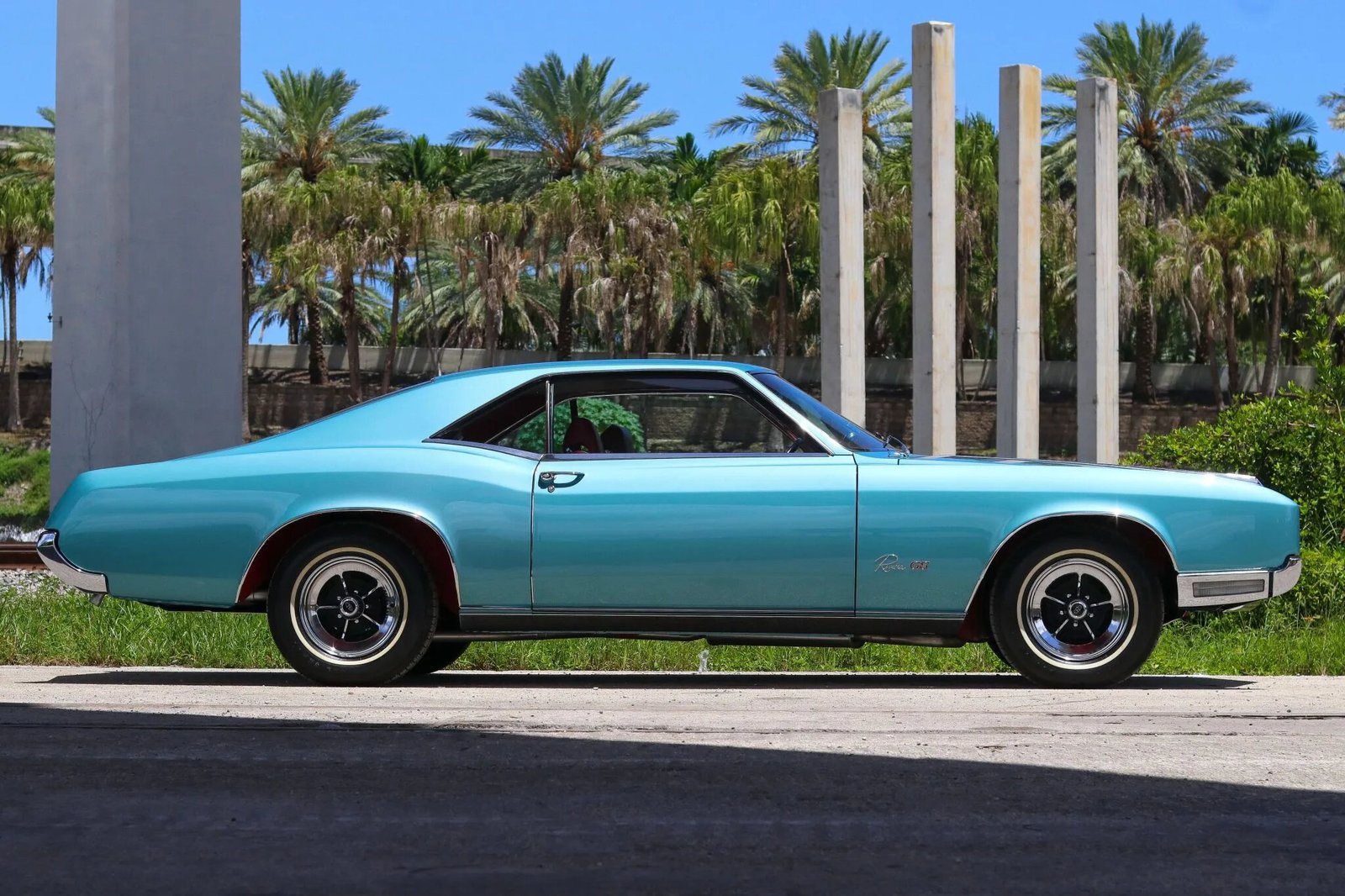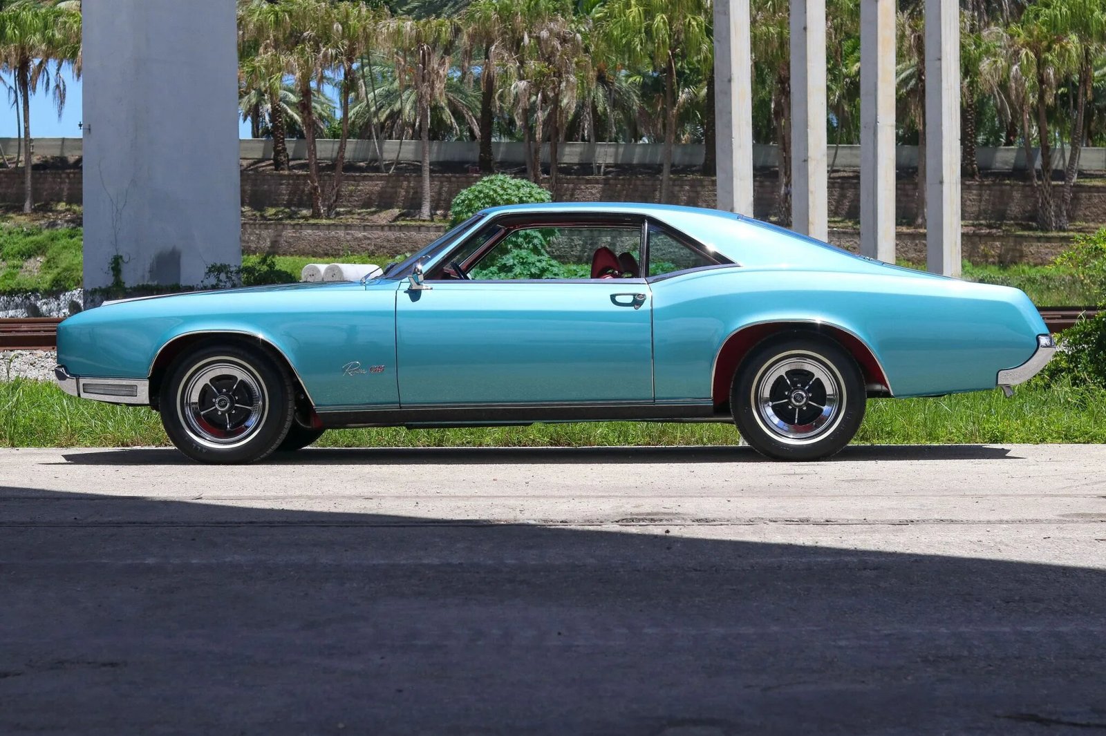 This 1967 Buick Riviera GS is a two-door Sport Coupe Hardtop, and is powered by a 430ci V8 paired with a three-speed automatic transmission and is finished in metallic turquoise over red upholstery.
