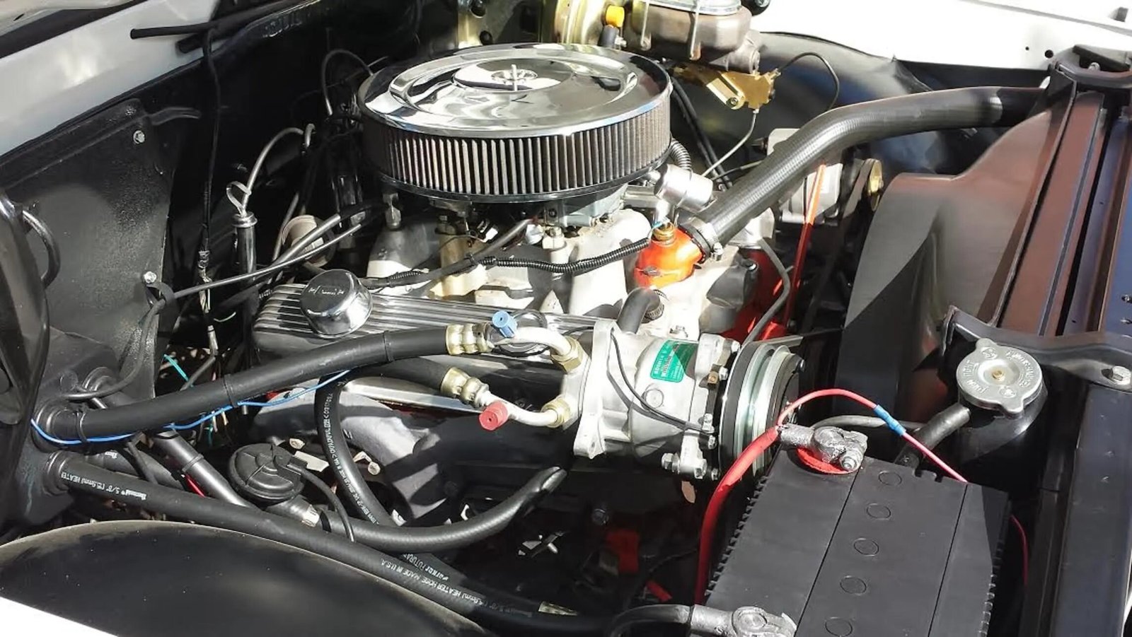 The 283ci V8 show a 1967 casting number and was rebuilt with a .030″ overbore in 2007.