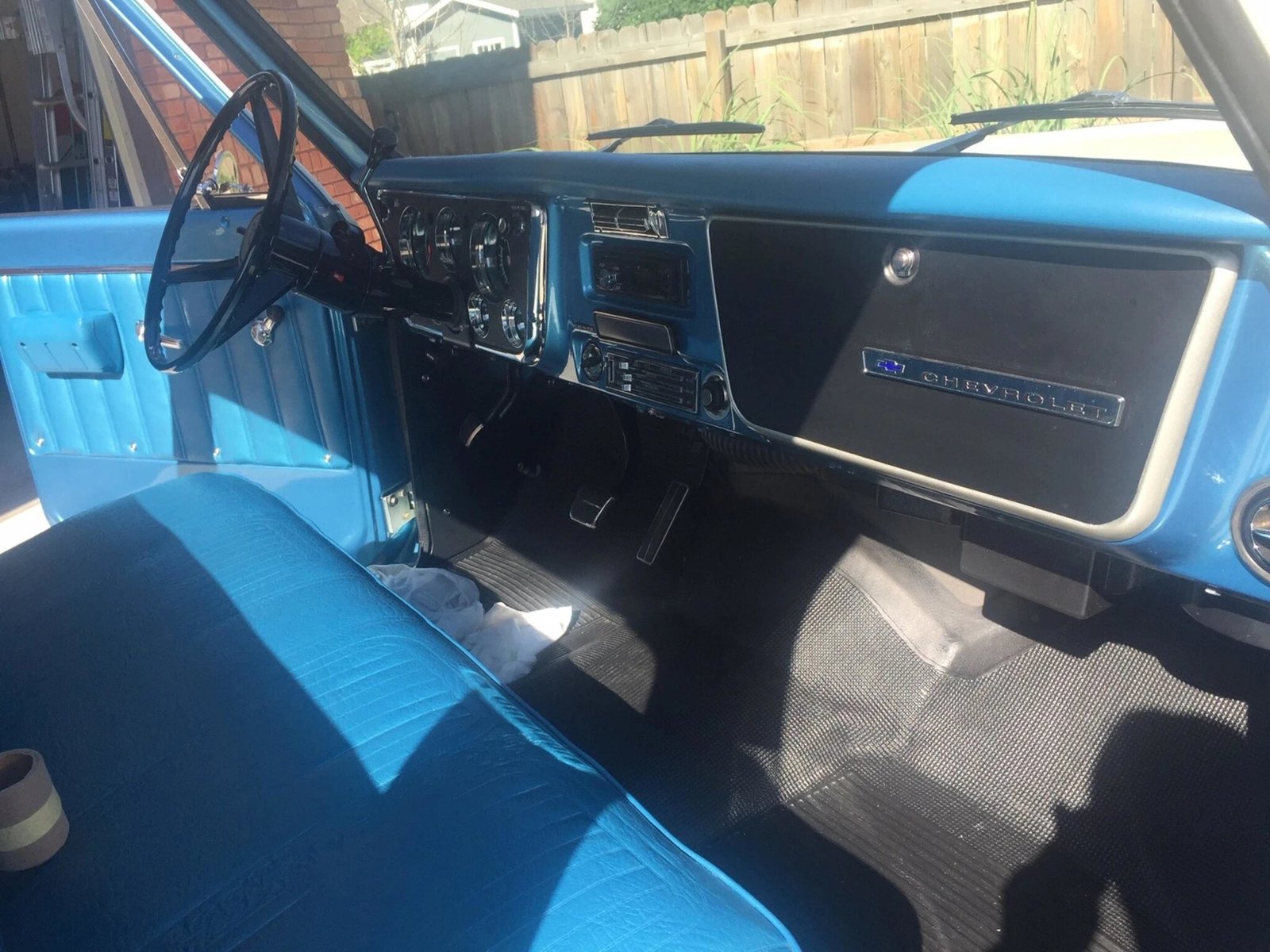 The interior is trimmed in blue vinyl with a color-matched dashboard and headliner as well as a black floor mat.