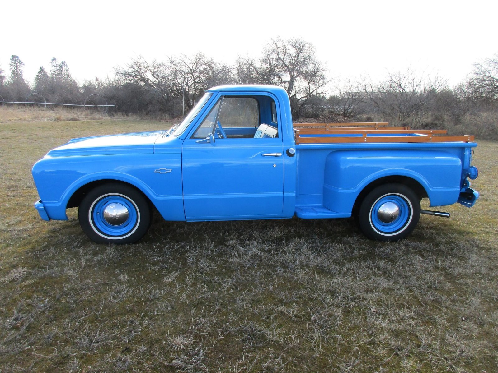 Exterior features include custom pinstriping, white front grille trim and tailgate details, custom wood bed stakes, and body-color bowtie badges.