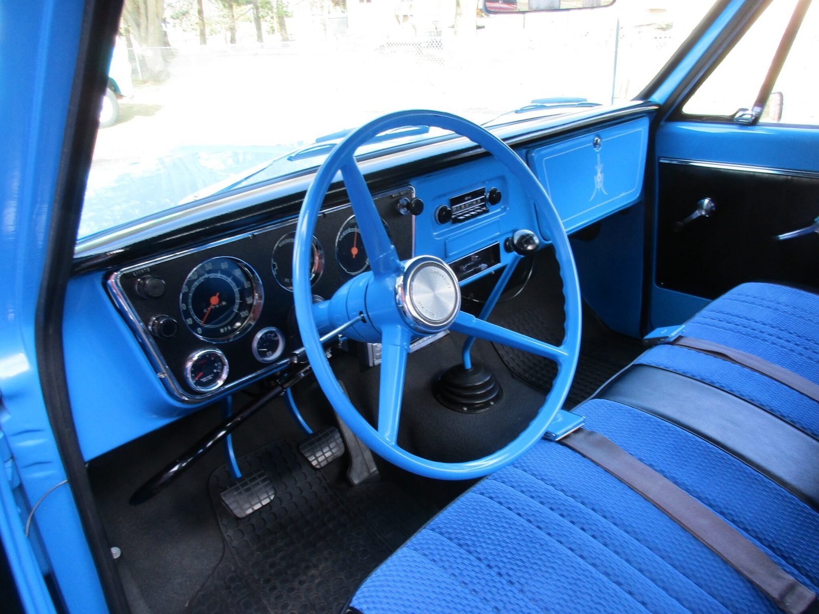 Amenities include a heater, an under-dash aftermarket stereo, lap belts, and custom pinstriping on the glove compartment door.