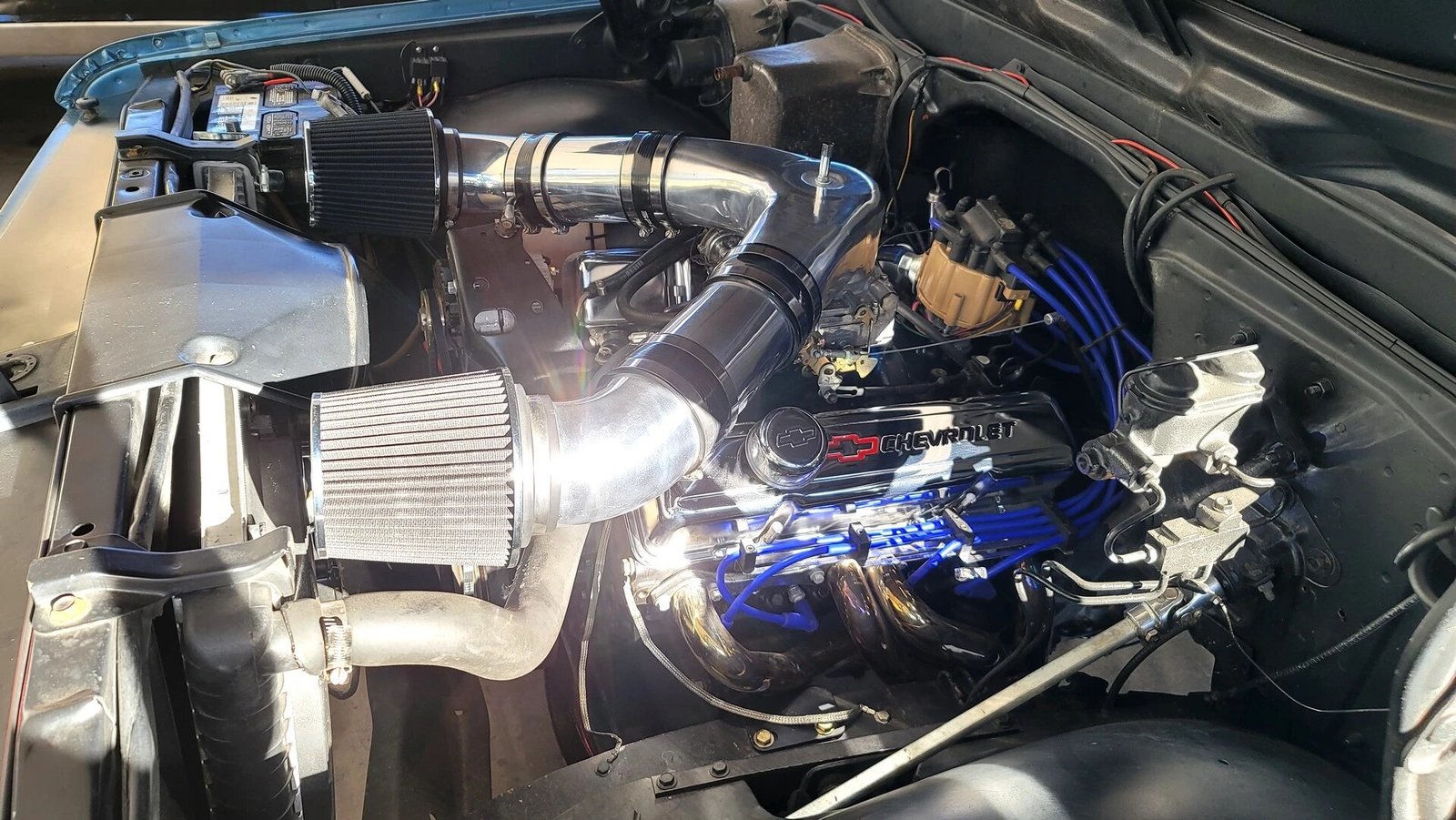 The factory inline-six was replaced with a 350ci V8 that was overhauled and features an Edelbrock AVS-2 carburetor, dual air cleaners, and polished valve covers.