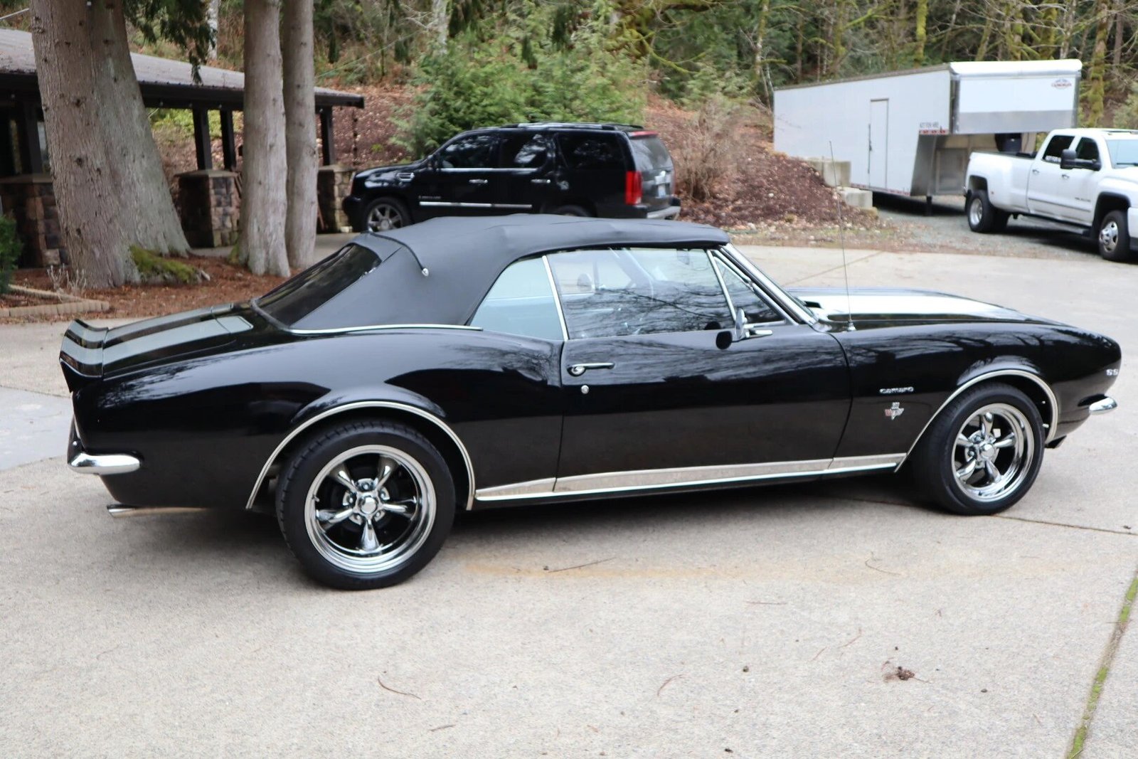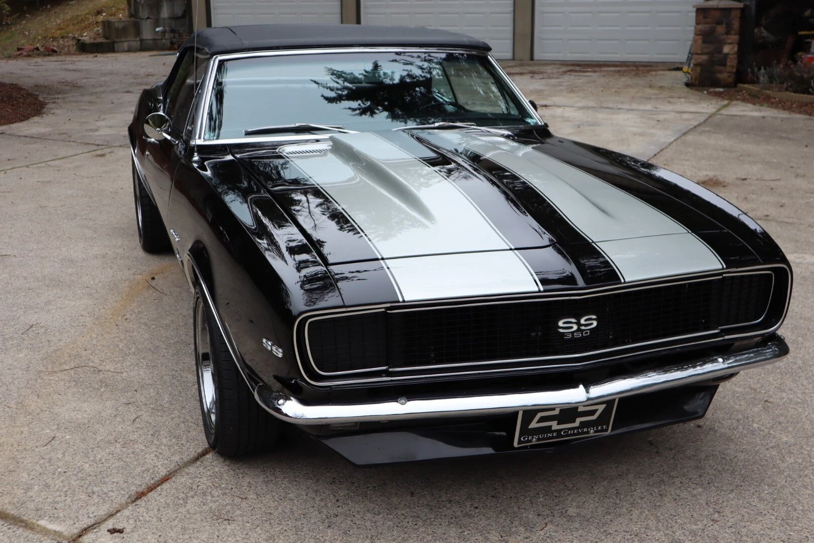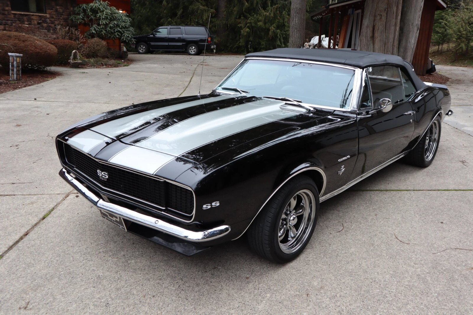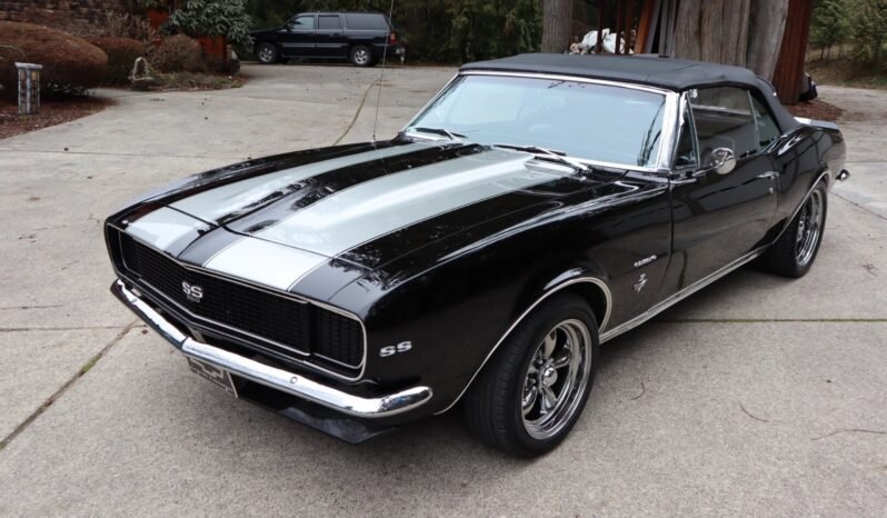 This 1967 Chevrolet Camaro convertible is powered by a 350ci V8 mated with a three-speed automatic transmission and is finished in black with silver stripes over deluxe black vinyl upholstery. Equipment includes a black convertible top, front and rear spoilers, concealed headlamps, power steering, power front disc brakes, black chrome wheels, a 12-bolt Positraction rear axle, an Edelbrock intake manifold, long-tube headers, and a dual exhaust system.