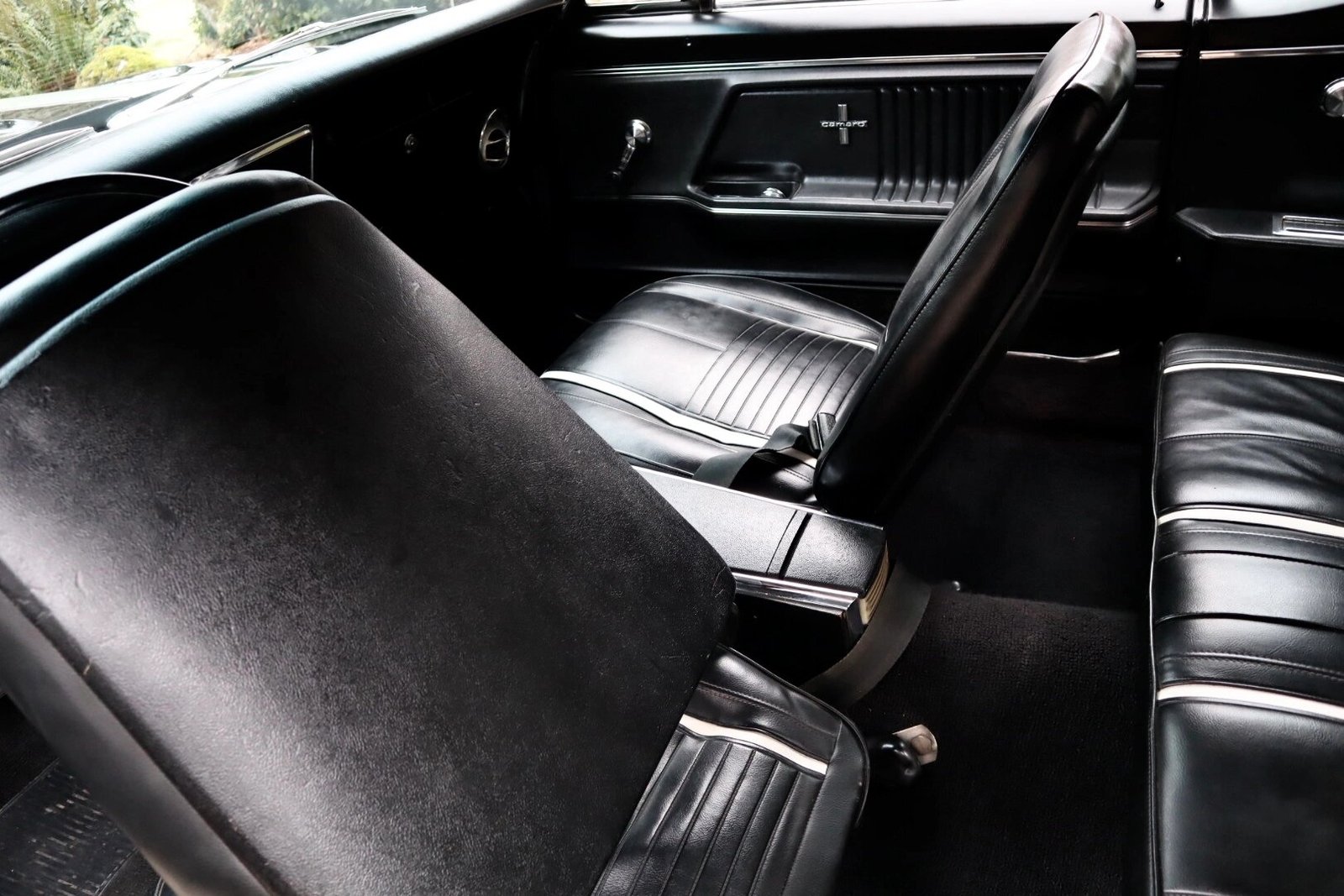 The deluxe-style front bucket seats and rear bench are trimmed in black vinyl upholstery with white accents.
