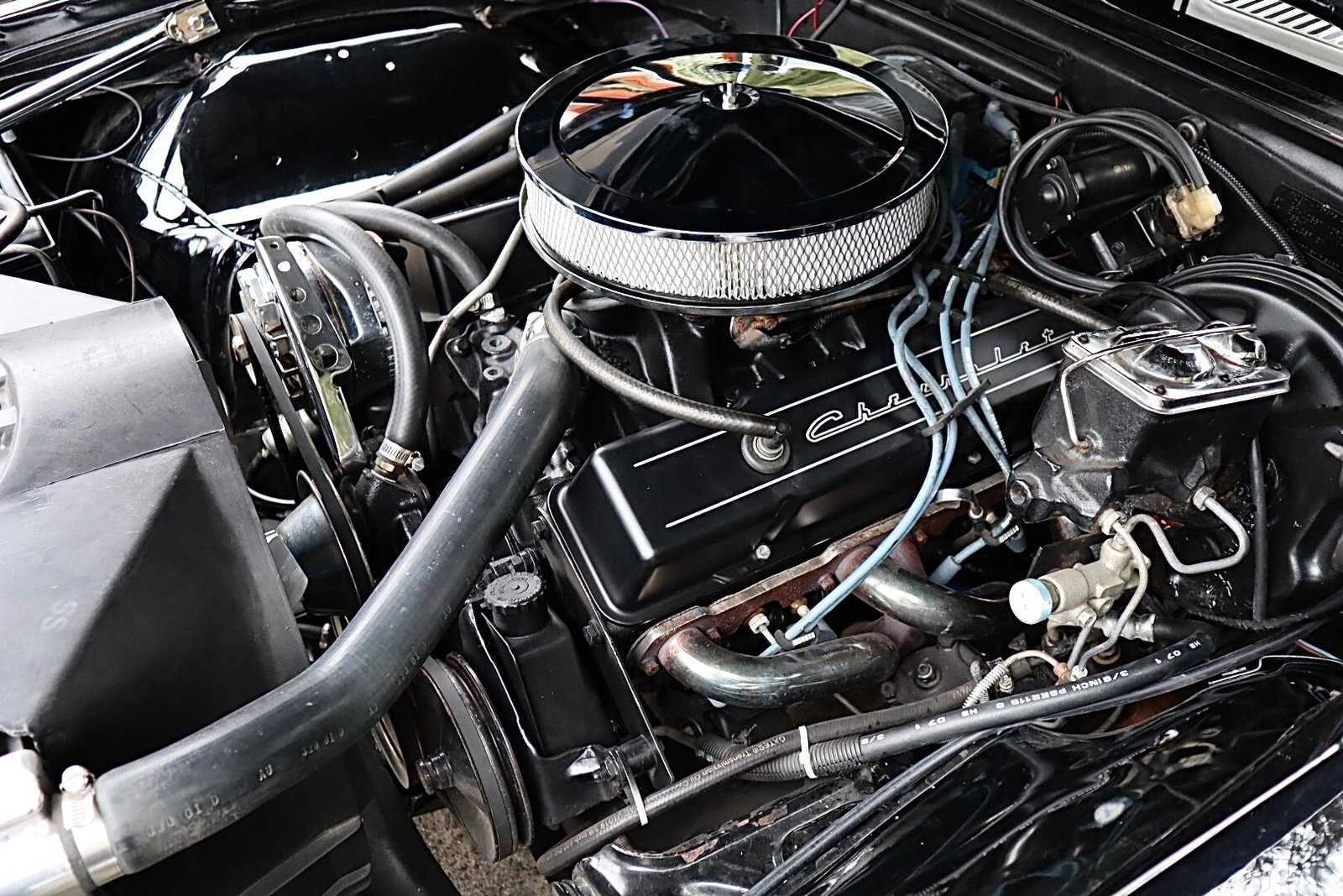 The 350ci V8 features a black-finished Edelbrock intake manifold, a four-barrel carburetor, an HEI-style distributor, Chevrolet-script valve covers, and long-tube headers.
