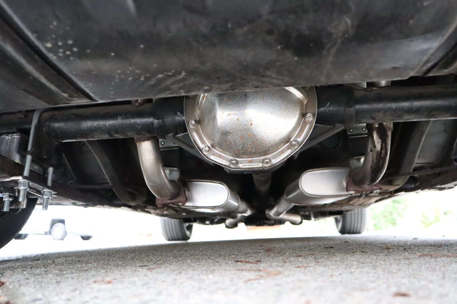 A dual exhaust system with aftermarket mufflers has been installed.
