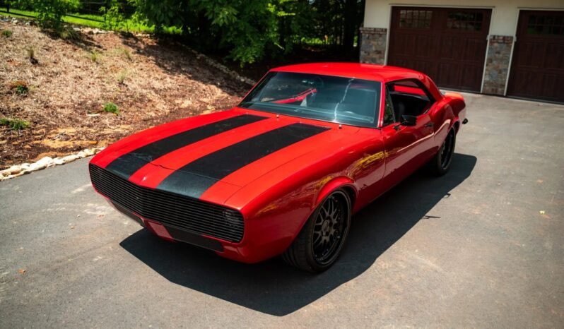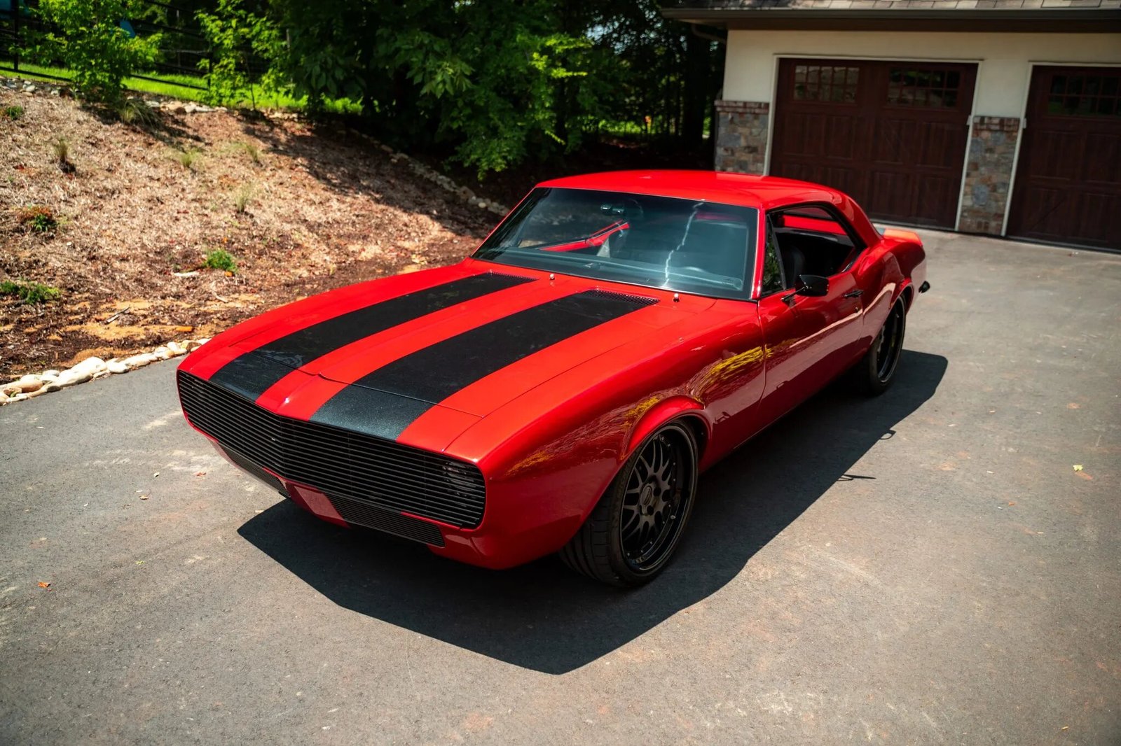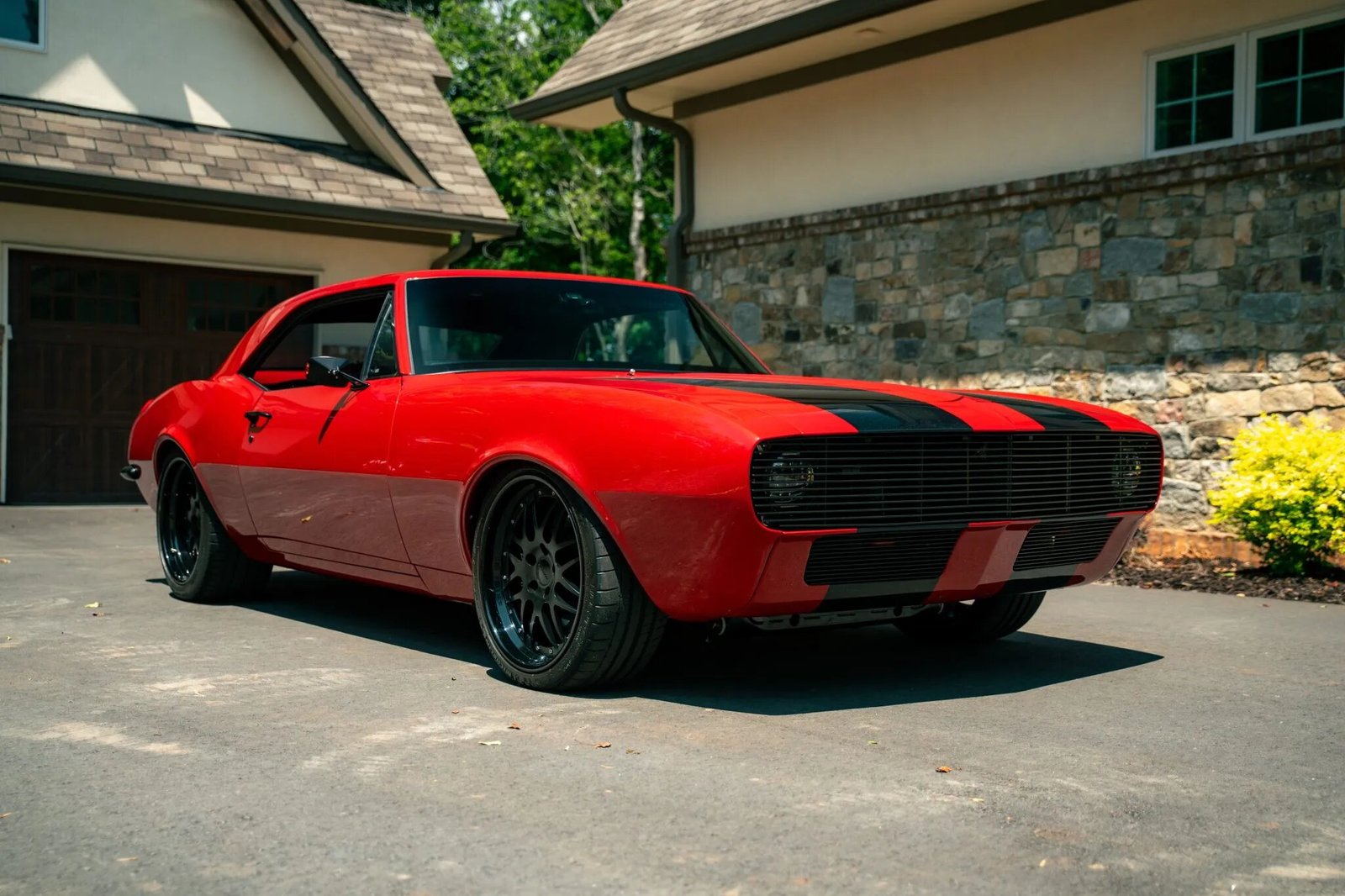 This 1967 Chevrolet Camaro coupe was subsequent build involved installing a 7.0-liter LS7 V8, a Tremec six-speed manual transmission, and a Detroit Speed suspension. Equipment includes Mast Motorsport cylinder heads, a dual exhaust system with Flowmaster mufflers, and a 9″ rear end. The car rides on 19″ Forgeline wheels, and braking is handled by Wilwood discs. Bodywork is finished in metallic burgundy with black hood stripes and features LED headlights, a full-length front grille, and a custom rear spoiler. Front bucket seats and individual rear seats are trimmed in black leather and microsude, and the flow-through center console features a fabricated shifter and front and rear cupholders. Additional features include a Vintage Air climate control system, a multimedia stereo, a MOMO steering wheel, Classic Instruments gauges, and power windows.