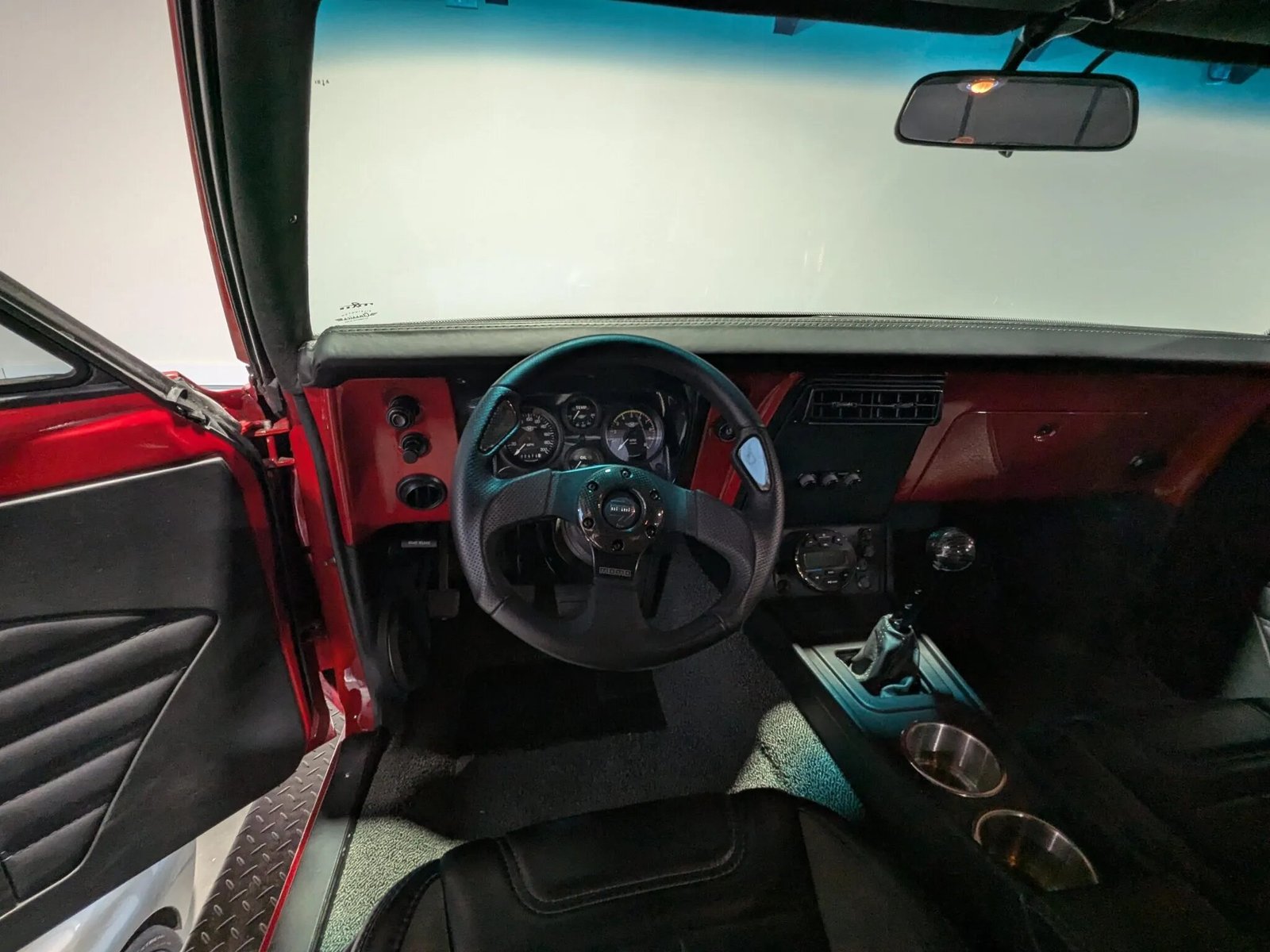 The revised bodywork has been refinished in burgundy metallic with dual black hood stripes that extend to the custom fiberglass rear spoiler. LED headlights sit behind a full-length grille complemented by coordinated inserts in the front valance. Additional details include Ringbrothers side mirrors, custom taillights, and black-finished billet door handles. The front end and lower body work are protected by clear paint-protection film, and a ceramic coating has been applied as well.