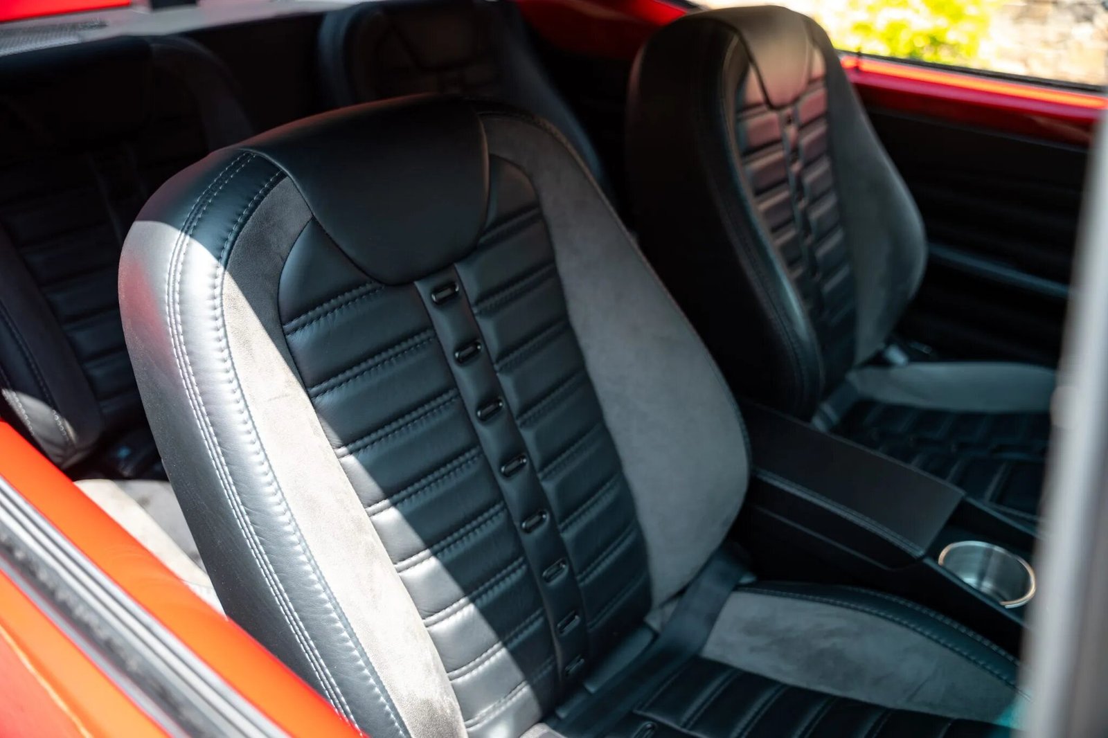 The leather-wrapped MOMO steering wheel fronts Classic Instruments readouts including a 200-mph speedometer, a 10k-rpm tachometer, and auxiliary gauges.