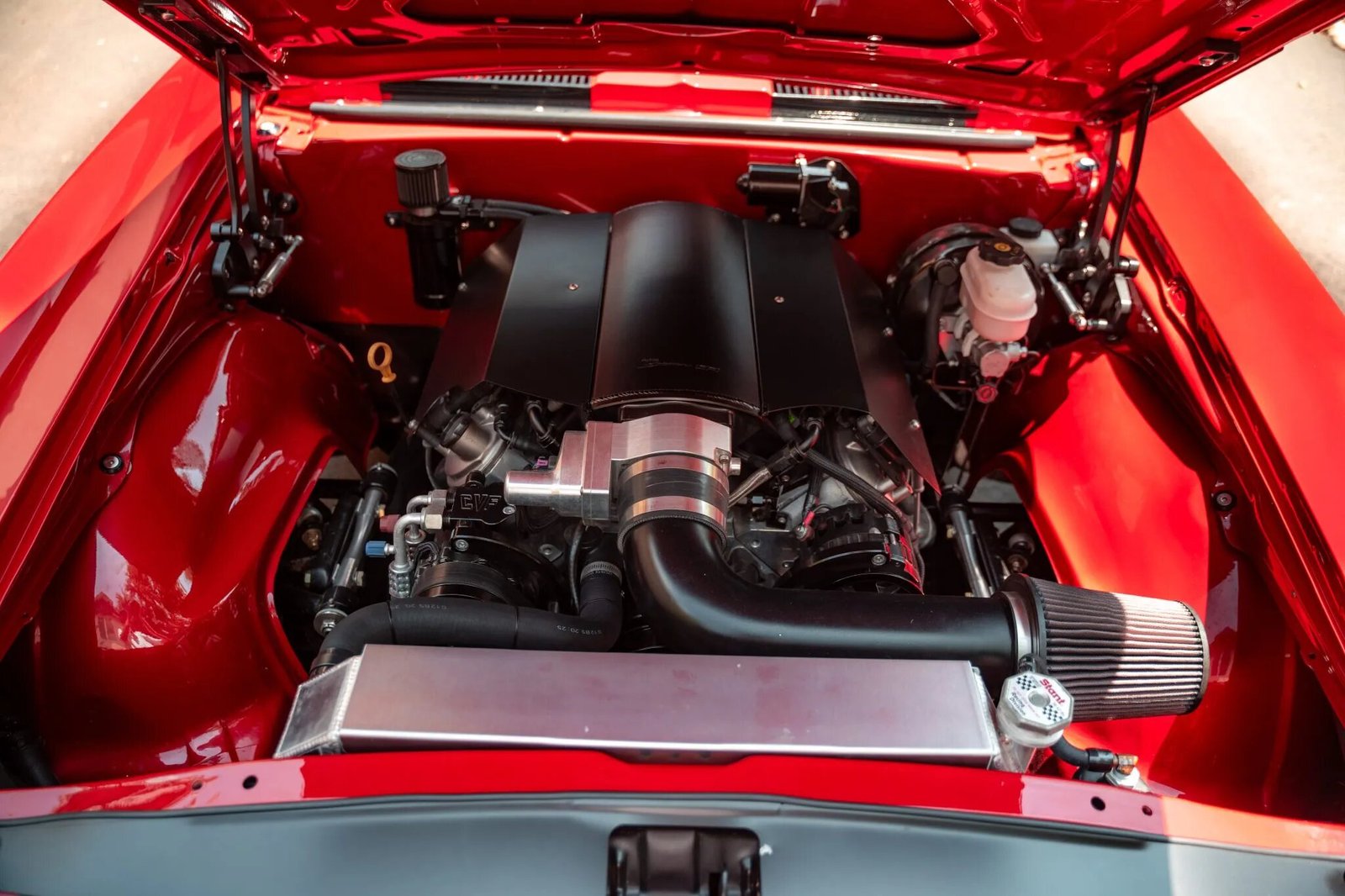 Power is sent to the rear wheels through a Tremec T56 six-speed manual transmission and a 9″ rear end.