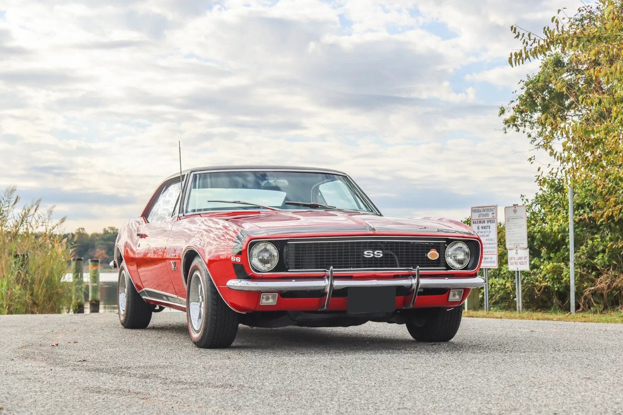 The car left the factory finished in Sierra Fawn with a white vinyl roof and was refinished in its current shade of red with a black bumblebee stripe and a black vinyl roof. Exterior details include chrome trim, SS badging, and front and rear bumper guards.