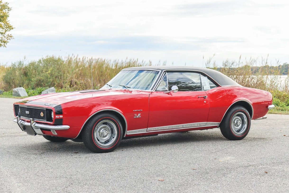 This 1967 Chevrolet Camaro RS/SS coupe is powered by a 396ci V8 paired with a three-speed automatic transmission and 12-bolt rear axle. The car was refinished in red with a black vinyl roof, and equipment includes the Rally Sport package, 14″ Rally wheels, chrome trim, power steering and brakes, an aftermarket radio, and a center console.