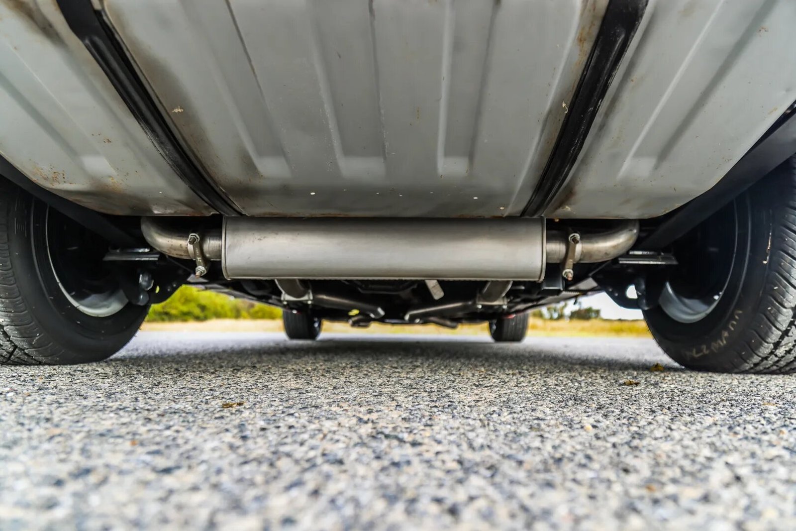 Silver-finished 14″ Rally wheels wear chrome hubcaps and trim rings and are mounted with 205/70 red-stripe BFGoodrich Silvertown Radial tires, a full-size spare tire is mounted in the trunk. Braking is handled by power-assisted drums at all four corners.