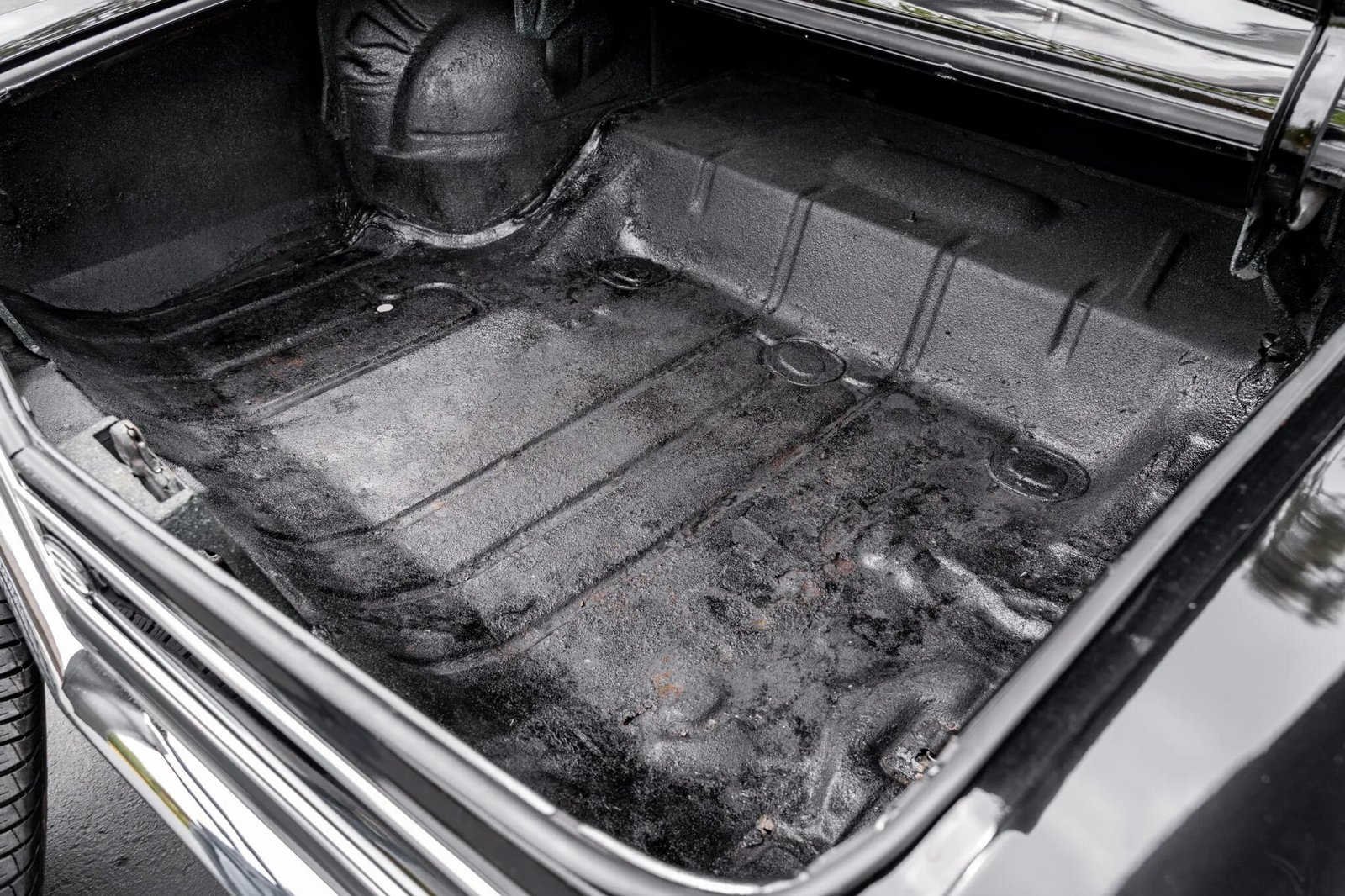 The seats are upholstered in black vinyl and the cabin features a matching dash, loop carpeting, and door panels.