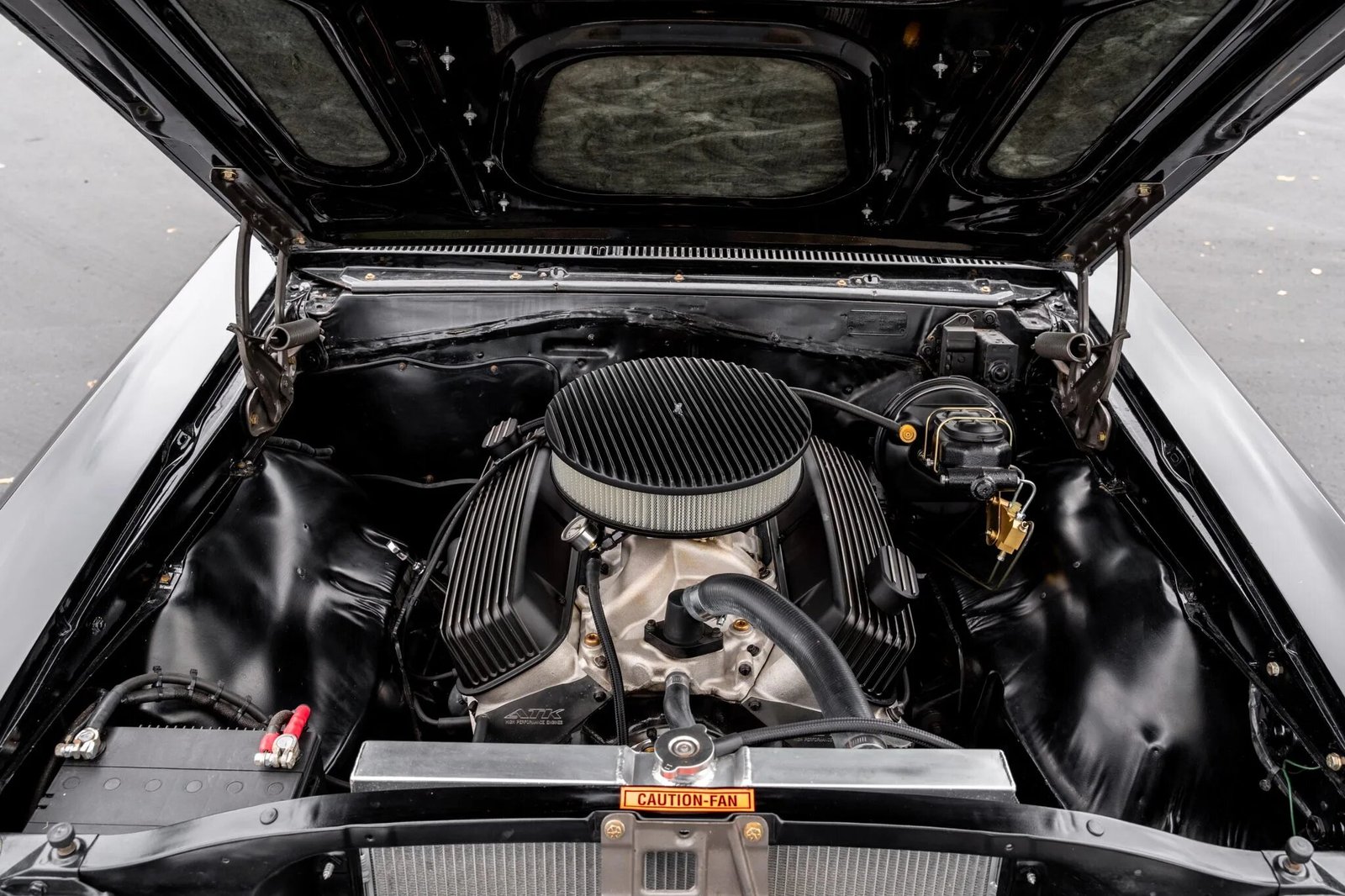 The replacement 454ci V8 was installed in 2018 by Main Street Auto Care, and is equipped with the following components: Holley 750-cfm carburetor, Edelbrock intake manifold, Edelbrock E-Street aluminum cylinder heads, Billet rocker arms, MSD ignition system, Aluminum radiator with two fans, Ceramic-coated Sanderson headers, Flowmaster exhaust, Finned air cleaner and valve covers.