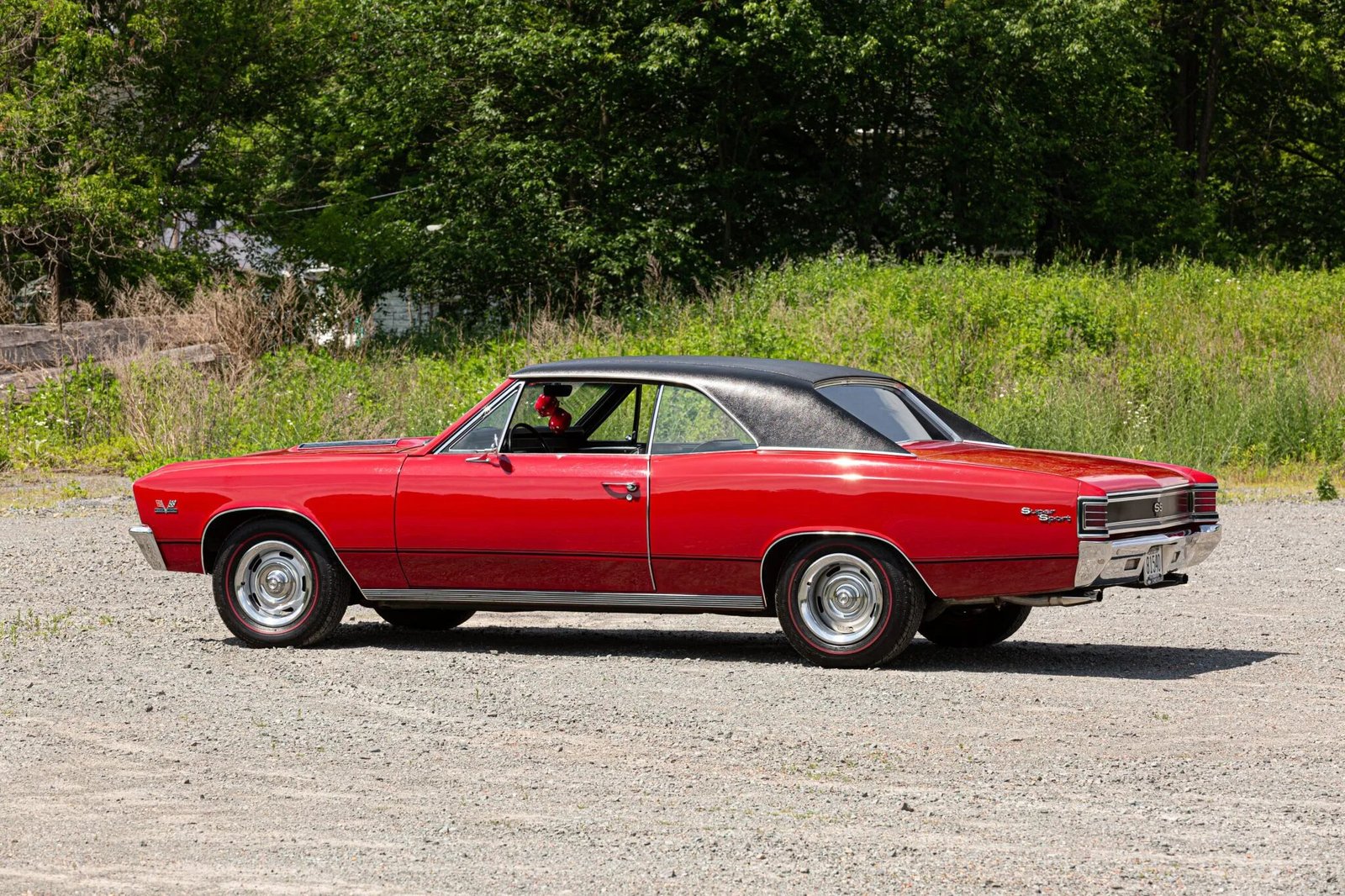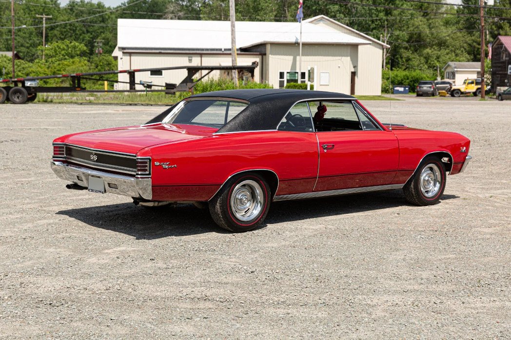 SS trim includes a blacked-out grille, faux twin hood scoops, 396 badging on the front fenders, SS396 emblems on the grille and rear cove, Super Sport script on the rear quarter panels, and ribbed rocker-panel moldings.