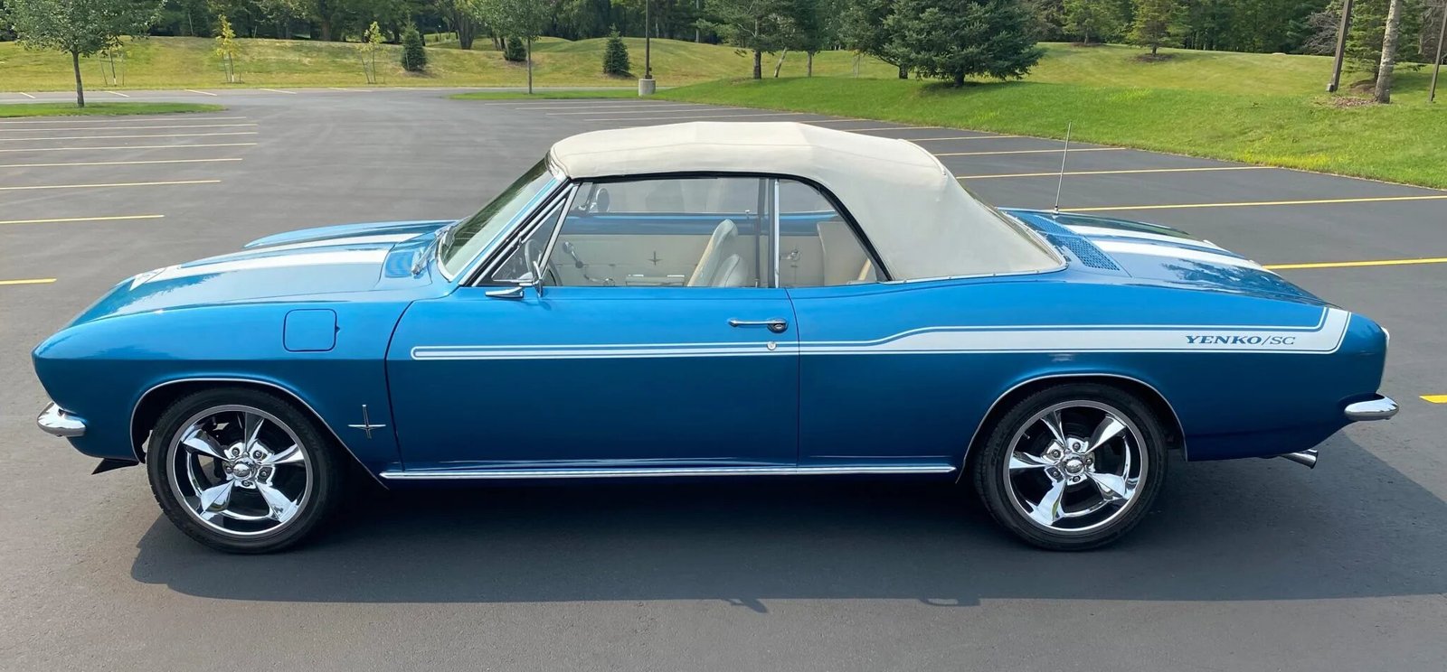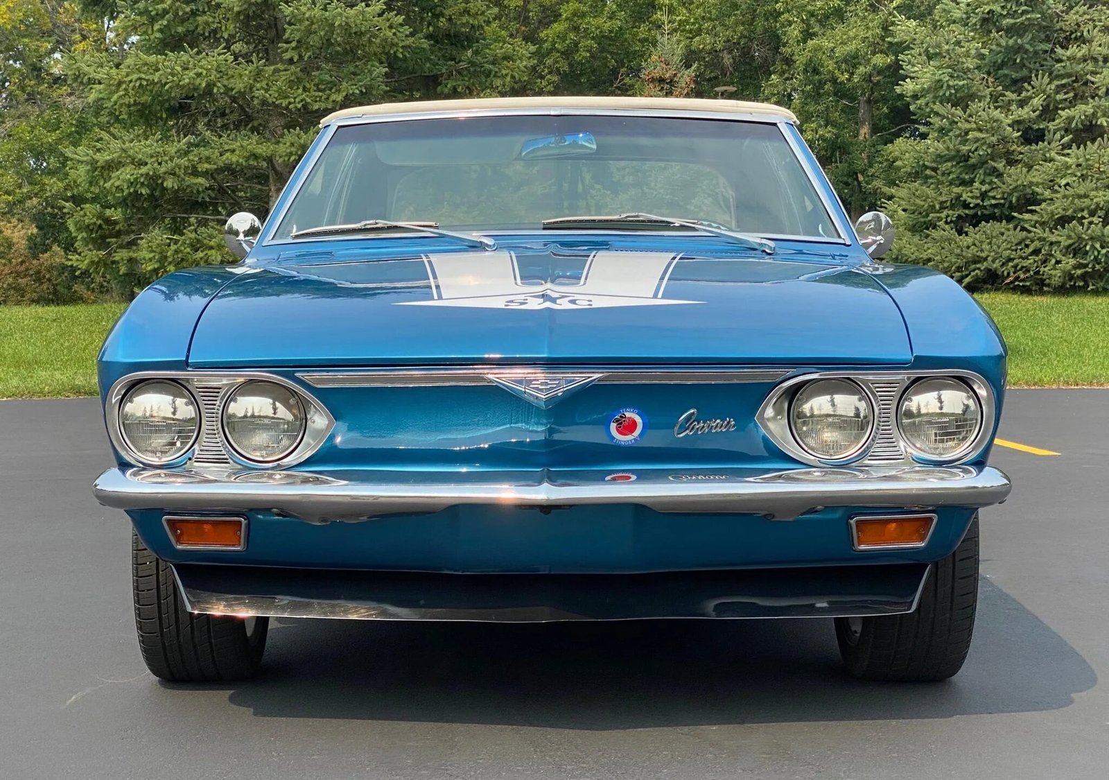 This 1967 Chevrolet Corvair Monza convertible is finished in metallic blue with a white convertible top over a white vinyl interior and is powered by an air-cooled 164ci flat-six paired with a two-speed automatic transaxle.