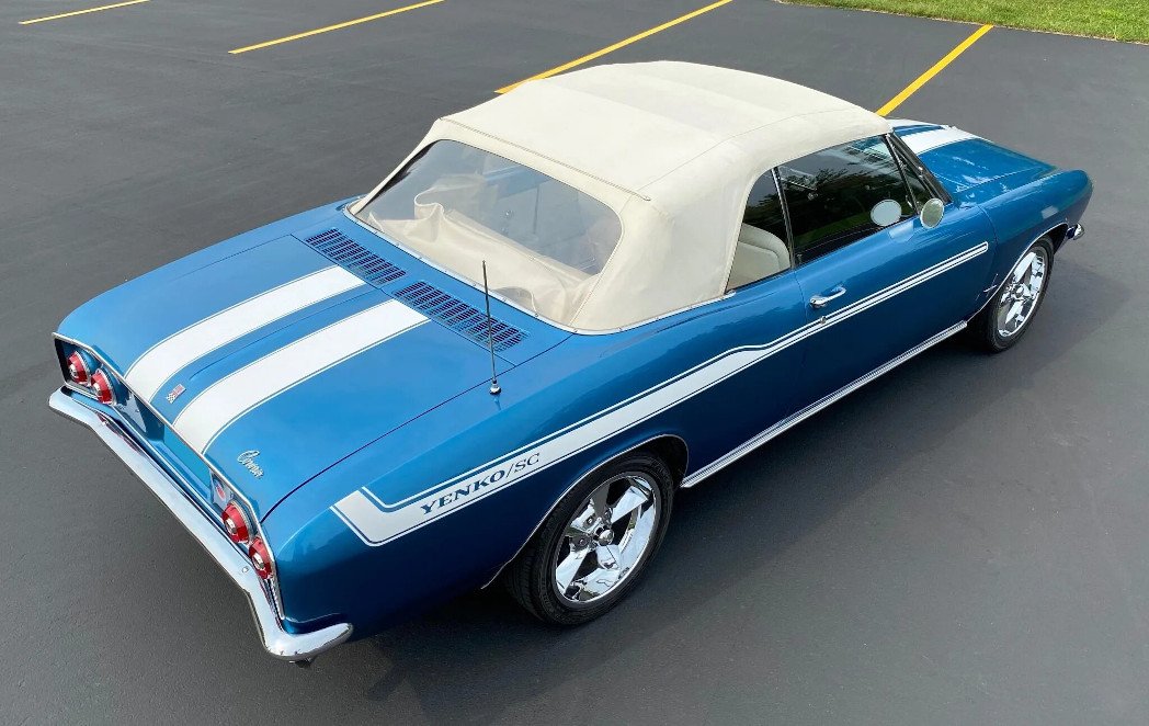 Features include Yenko-style graphics, front bucket seats, 17″ chrome wheels, an aftermarket steering wheel, and a digital stereo.