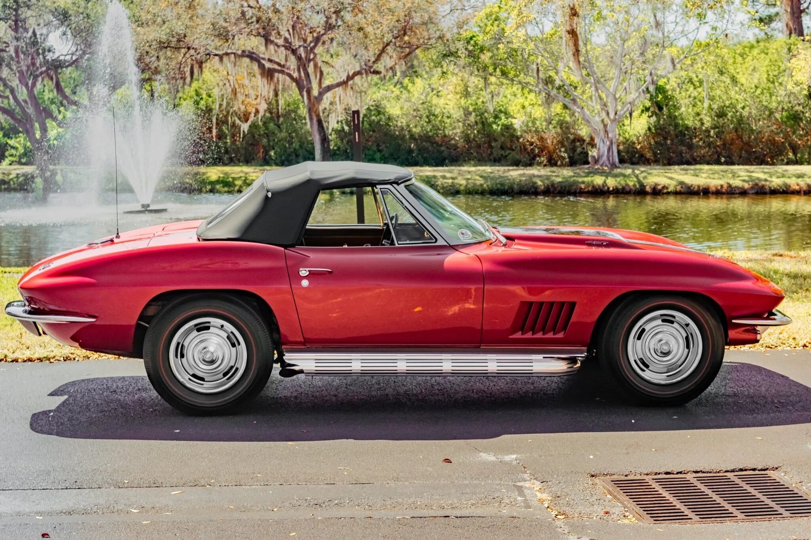 This 1967 Chevrolet Corvette convertible is finished in Marlboro Maroon with a black convertible top over saddle leather, and it was the subject of a two-year refurbishment completed in 2007 that have included a repaint and a rebuild of its numbers-matching engine.
