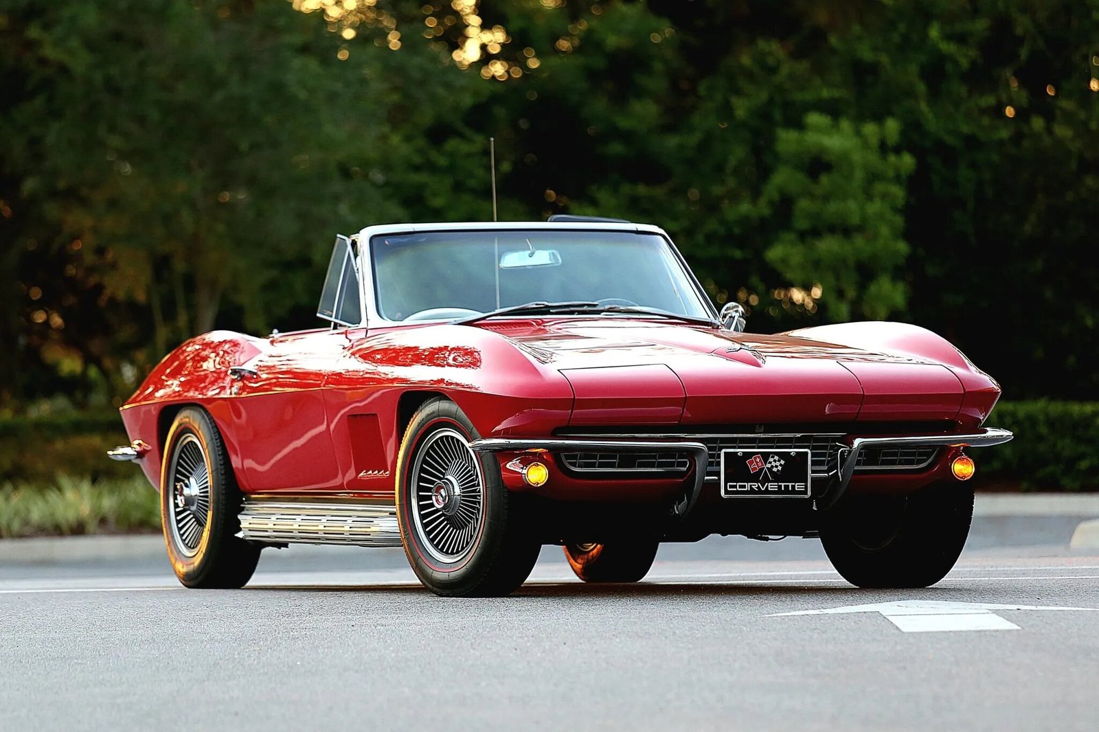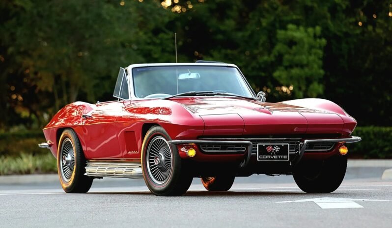 This 1967 Chevrolet Corvette convertible is powered by a 327ci V8 linked to a close-ratio four-speed manual transmission and a Positraction differential, and it is finished in red with a black soft top over black vinyl upholstery. Features include side exhaust pipes, a Delco AM/FM radio, electric windows, flip-up headlights, four-wheel disc brakes, and turbine-style 15” wheels.