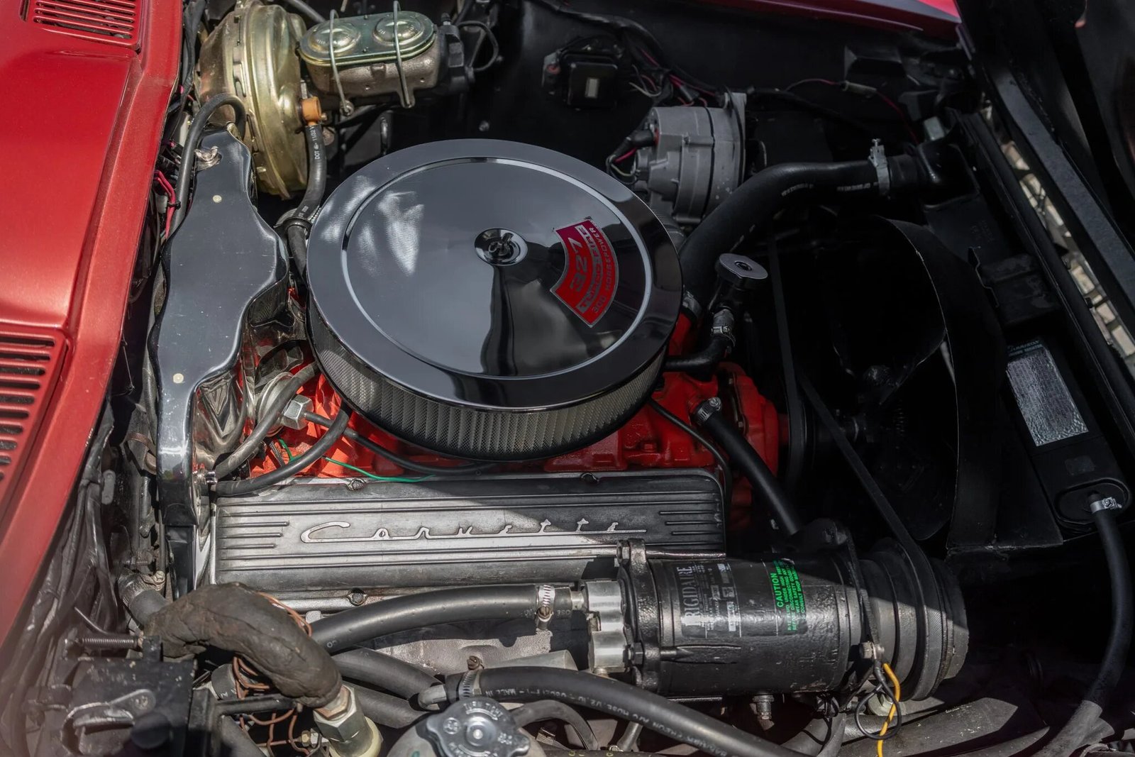 The 327ci V8 breathes through a four-barrel carburetor and features a chrome air cleaner lid and ignition cover as well as Corvette script valve covers.