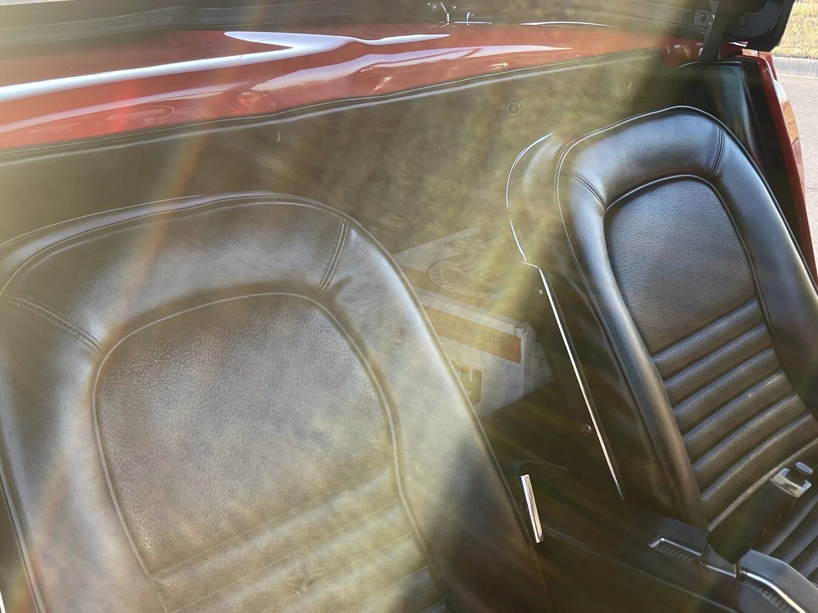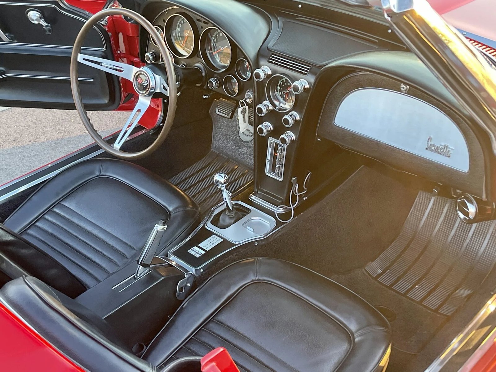 The cockpit features two low-back seats upholstered in black vinyl along with a matching dashboard and door panels accented by bright metallic trim.