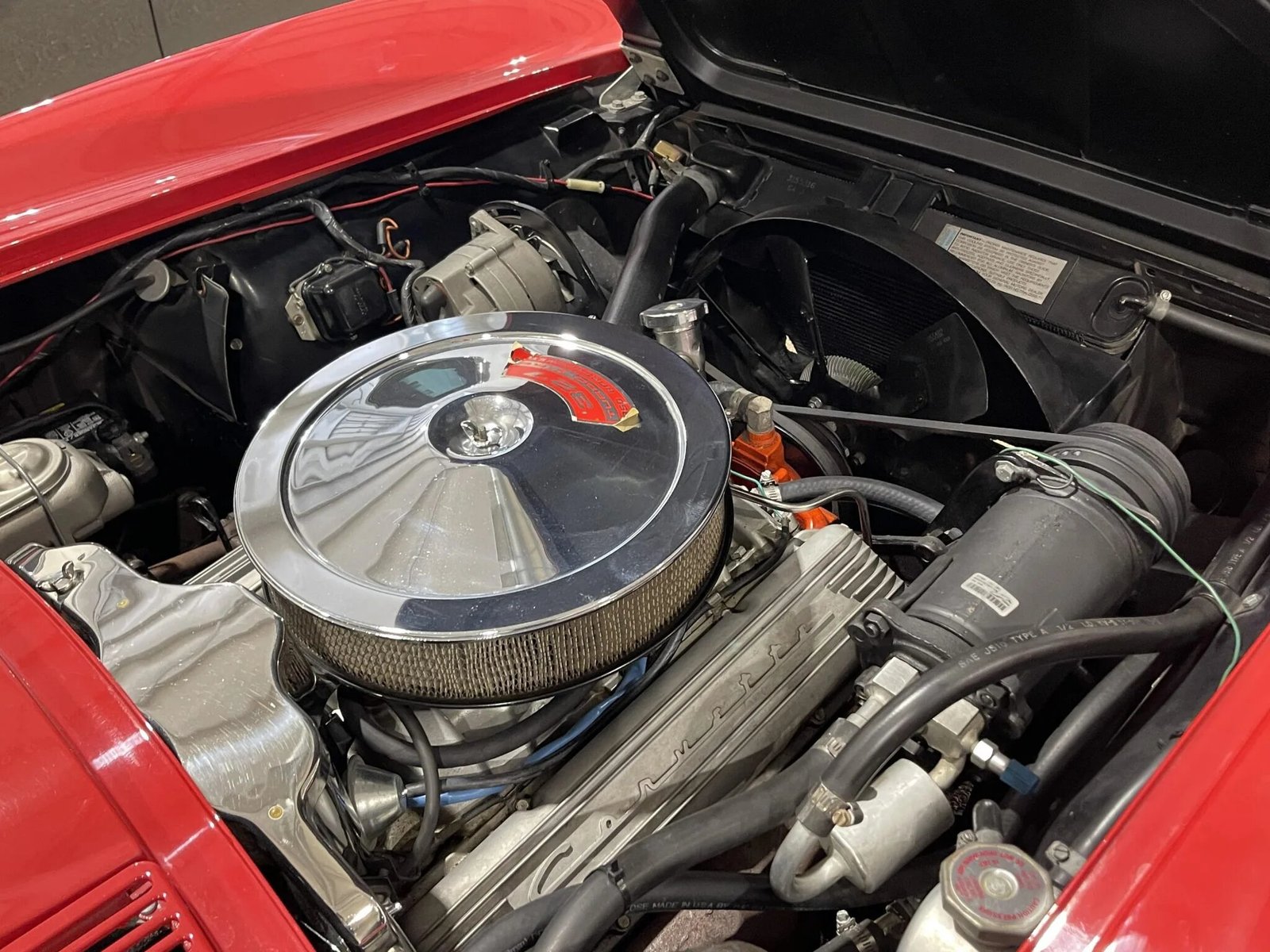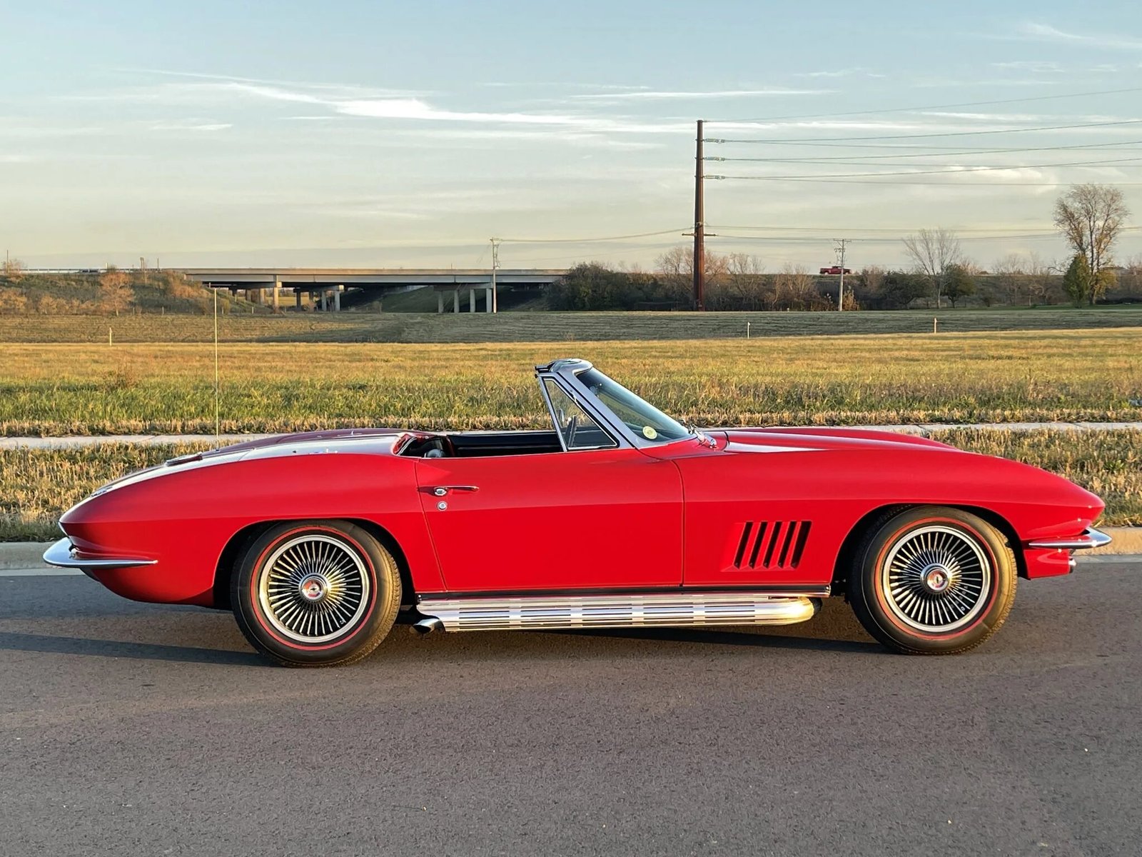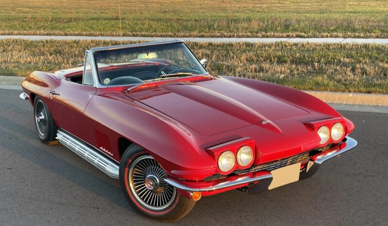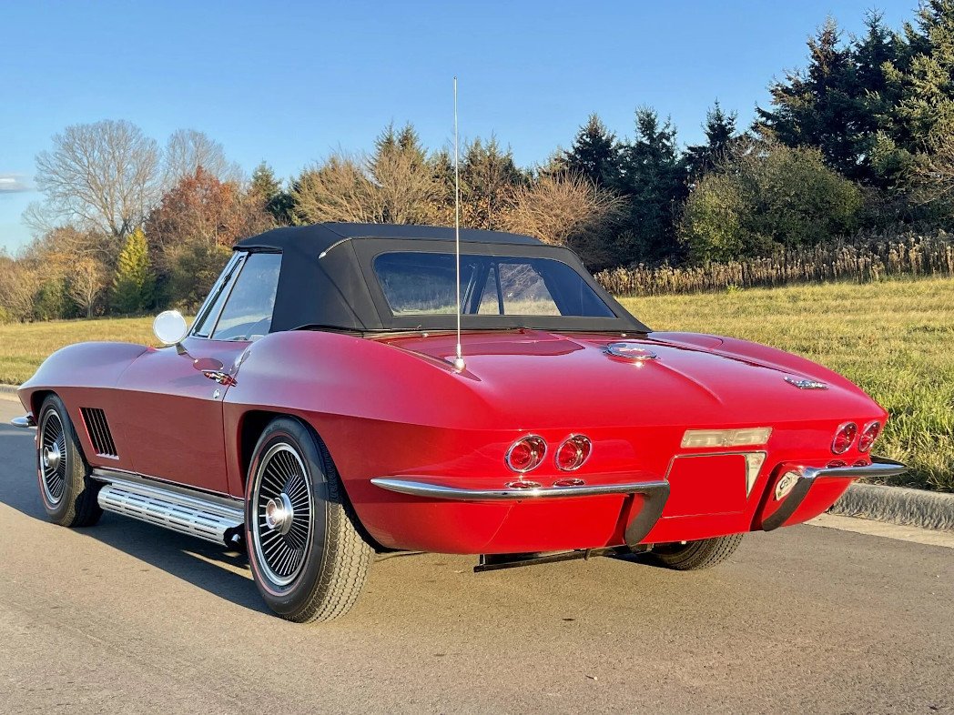 This 1967 Chevrolet Corvette is a red-over-black convertible powered by a 327ci V8 paired with a four-speed manual transmission.