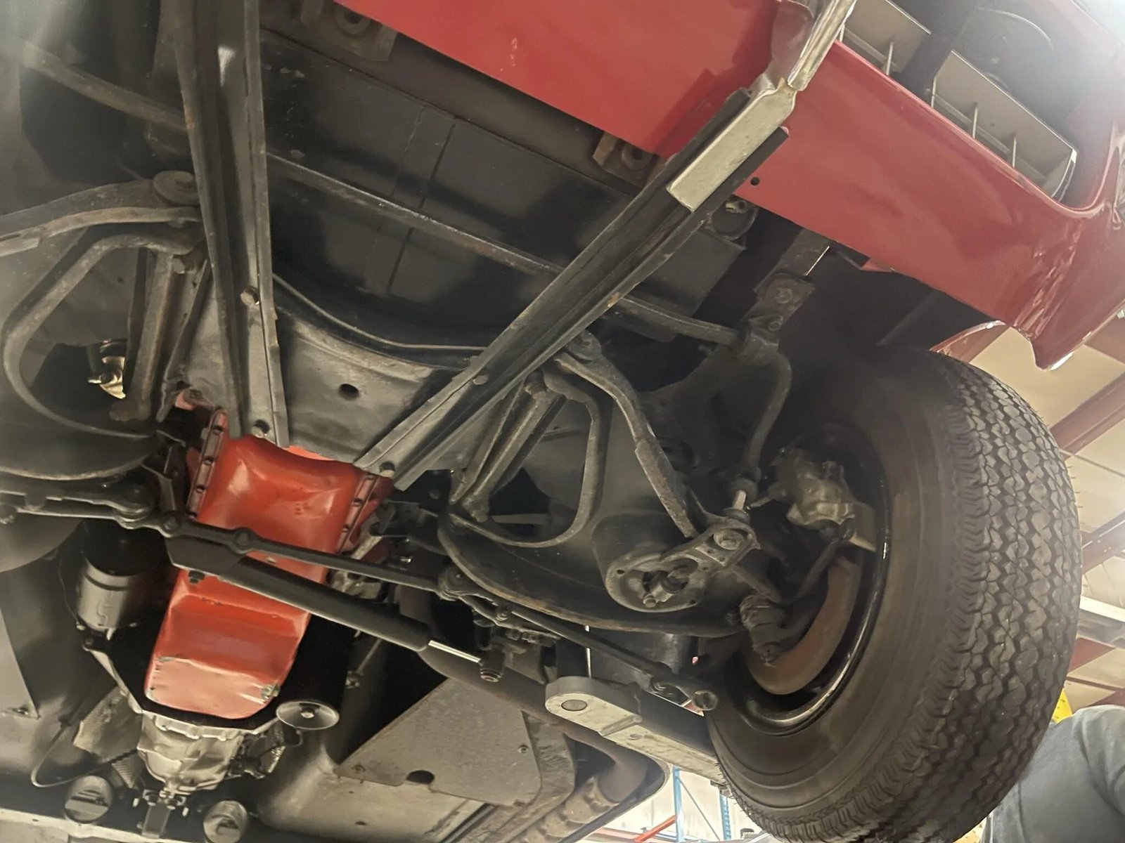 Lug-mounted 15″ turbine wheels wear Chevrolet center caps and are wrapped in Coker Classic 185R15 redline tires.