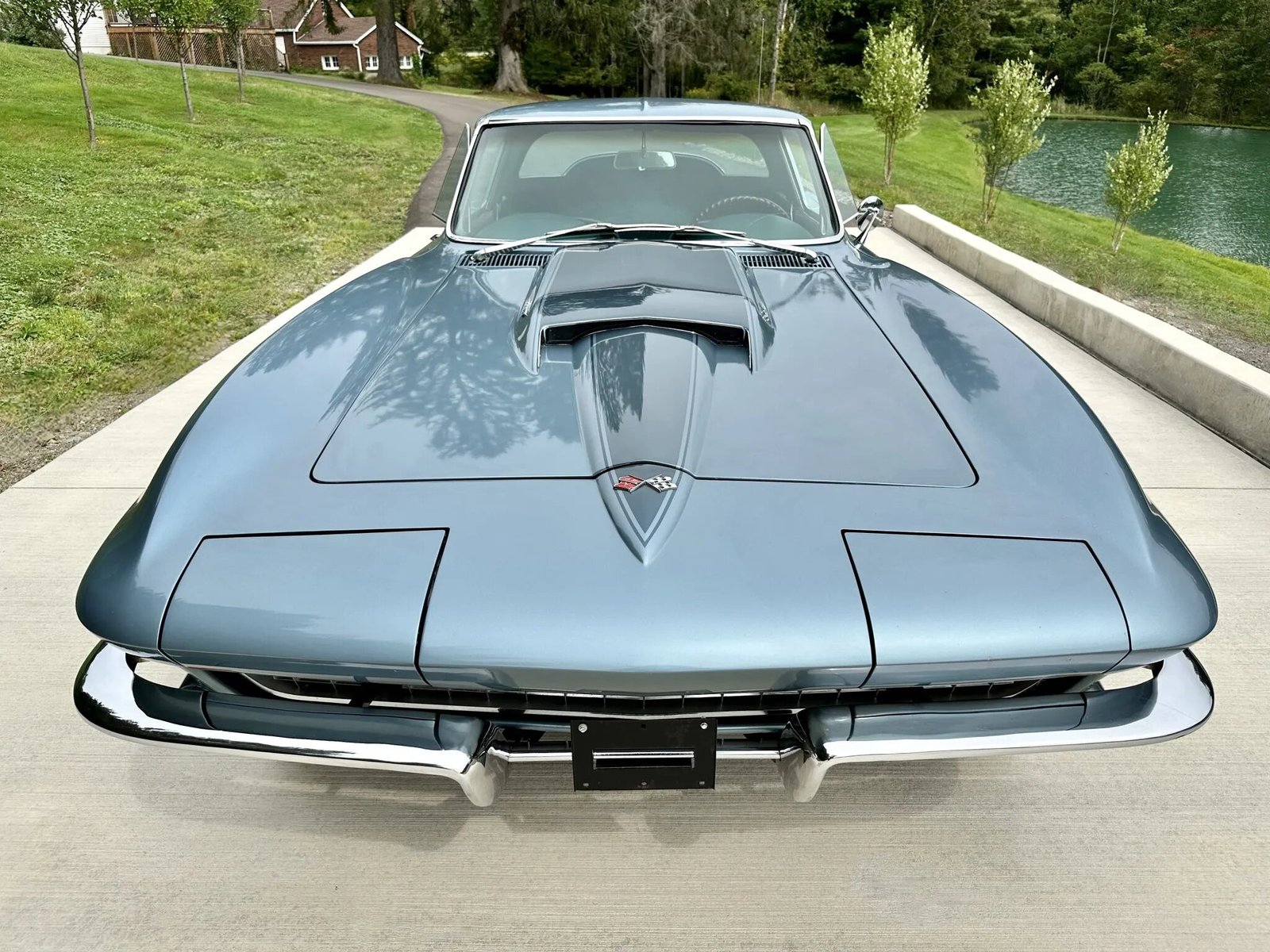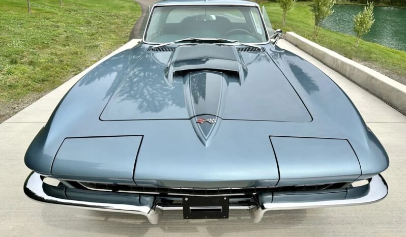 The fiberglass body left the factory finished in Lynndale Blue (977) and have been refinished around 1997. Features include a curved glass rear window, a domed hood, retractable headlights, chrome split bumperettes, fender vents, a driver-side mirror, and dual exhaust tips.