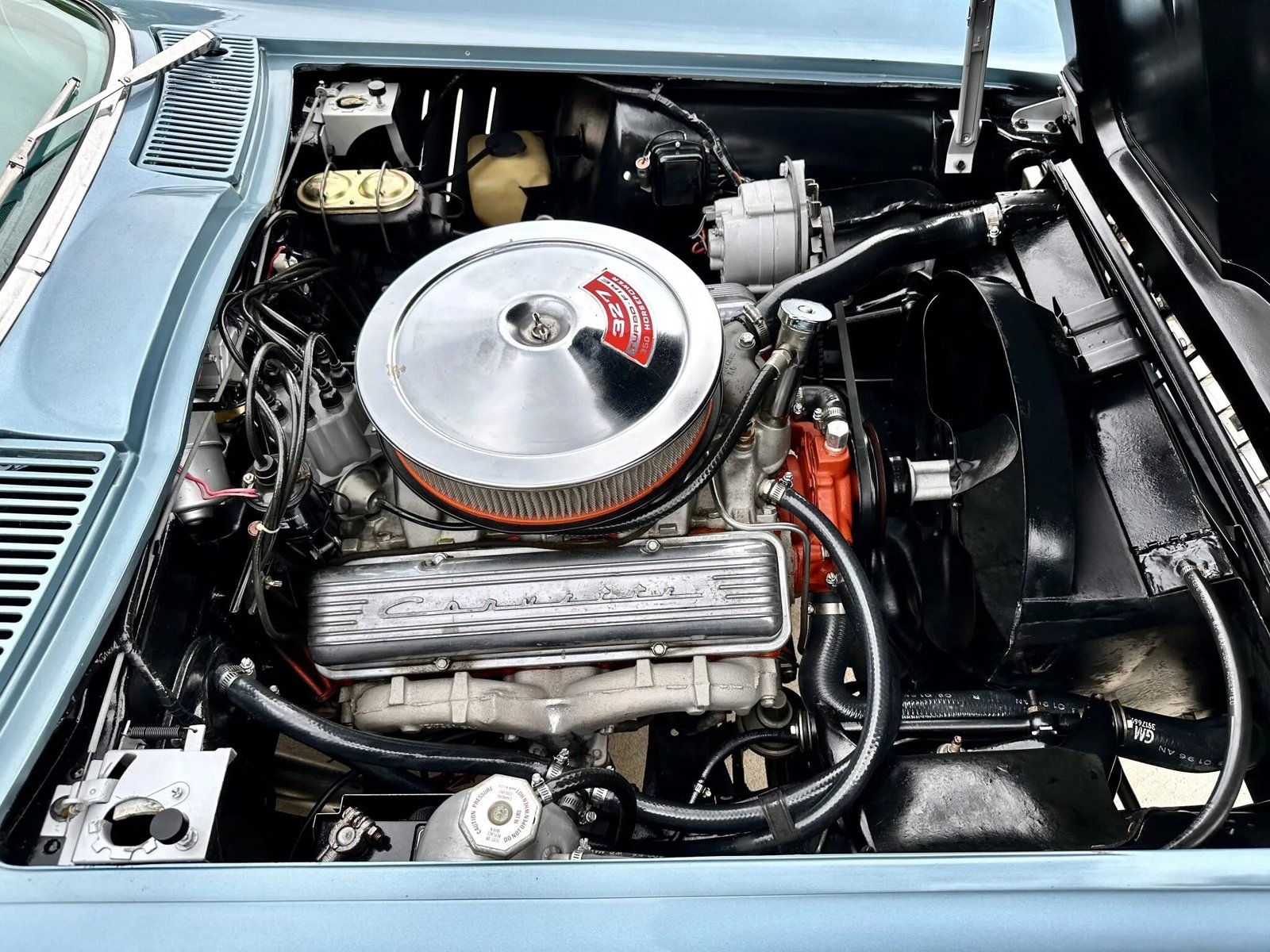 The 327ci L79 V8 is equipped with a single four-barrel carburetor and was factory rated at 350 horsepower and 360 lb-ft of torque. The engine have been rebuilt in 1997. The engine stamping is shown above. The HT suffix corresponds with a 350-horsepower, 327ci L79 V8 for use with a manual transmission. Power is sent to the rear wheels through a four-speed manual transmission that have been rebuilt in 1997.